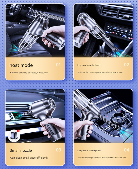 This 3-in-1 cordless handheld vacuum cleaner combines powerful suction, air blowing, and dusting functions in a compact and portable design. It is suitable for cleaning cars, homes, and offices with ease and convenience.