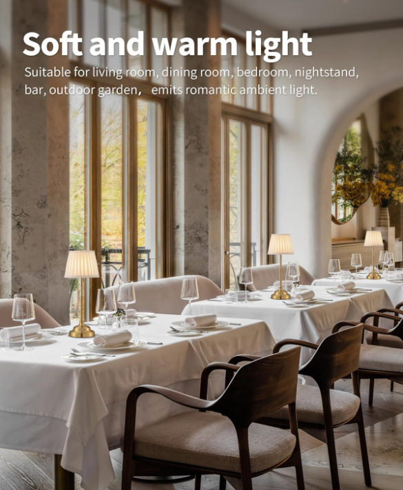 - Features: Cordless, rechargeable, stepless dimming, touch control, fabric shade