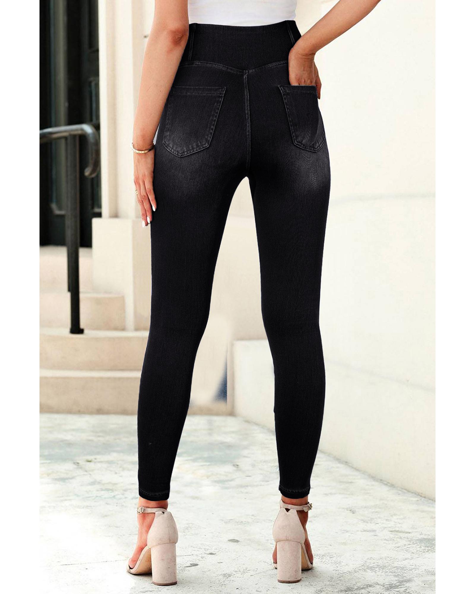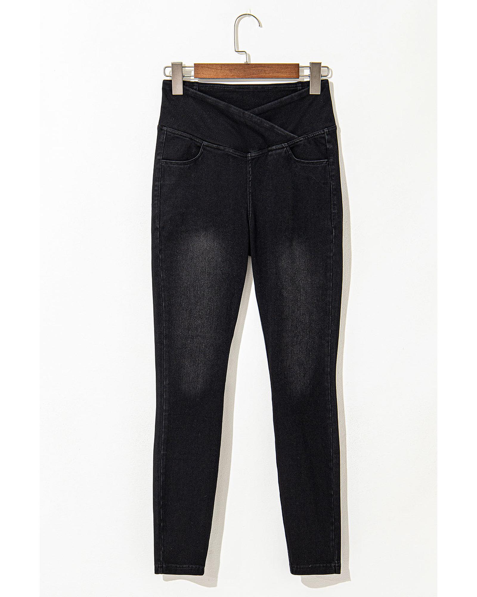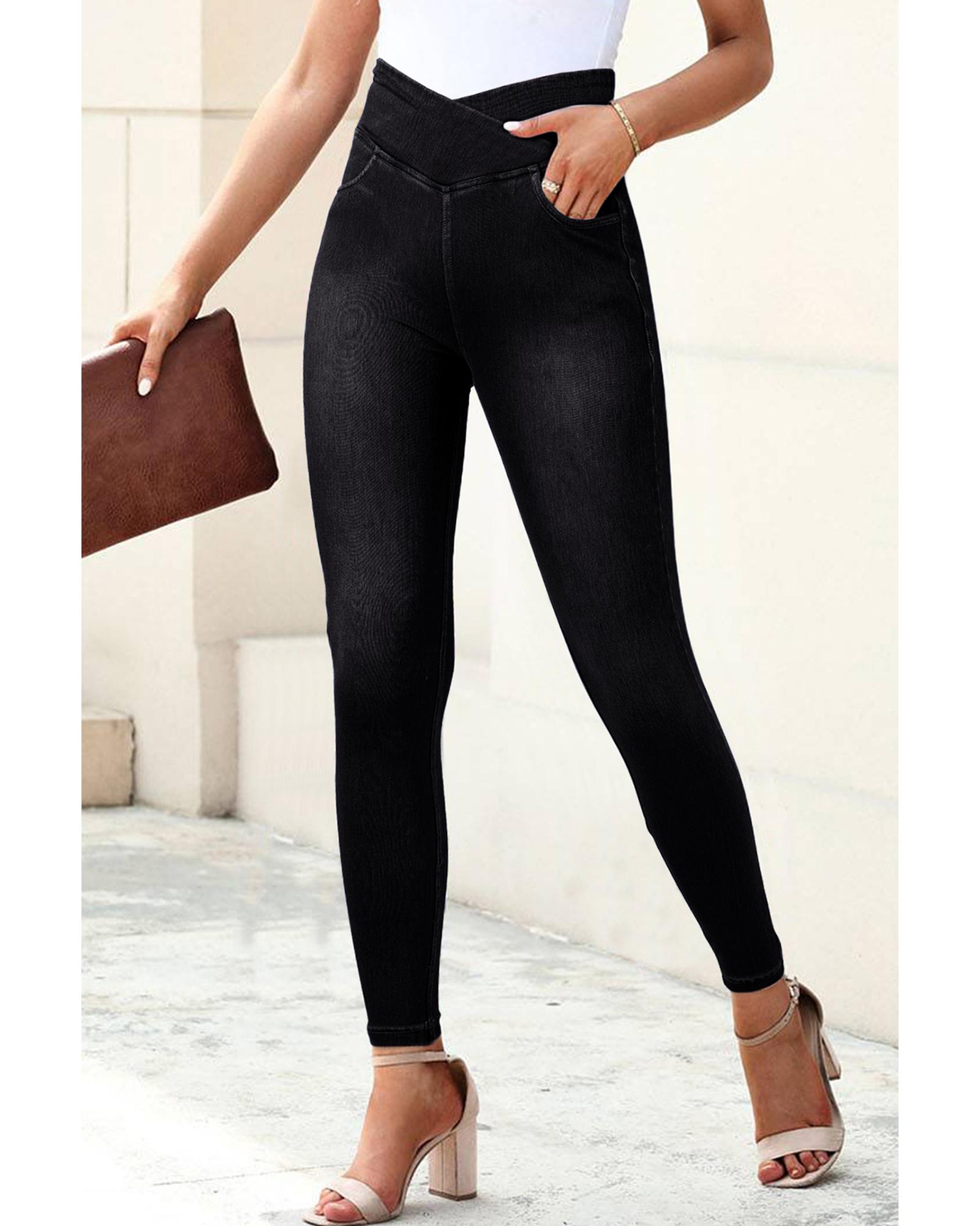 This pair of black arched waist jeggings features a stretchy, slim fit design that accentuates your curves while providing all-day comfort. The unique cross waist adds a stylish touch, making these jeggings suitable for everyday wear. They include convenient side pockets for storage and are crafted from a comfortable blend of polyester, cotton, and elastane.