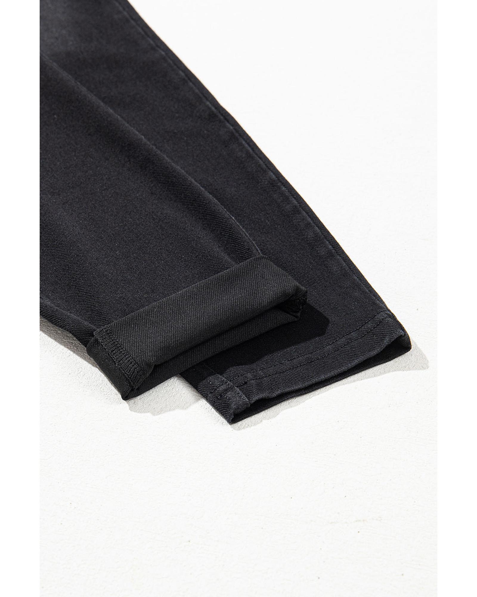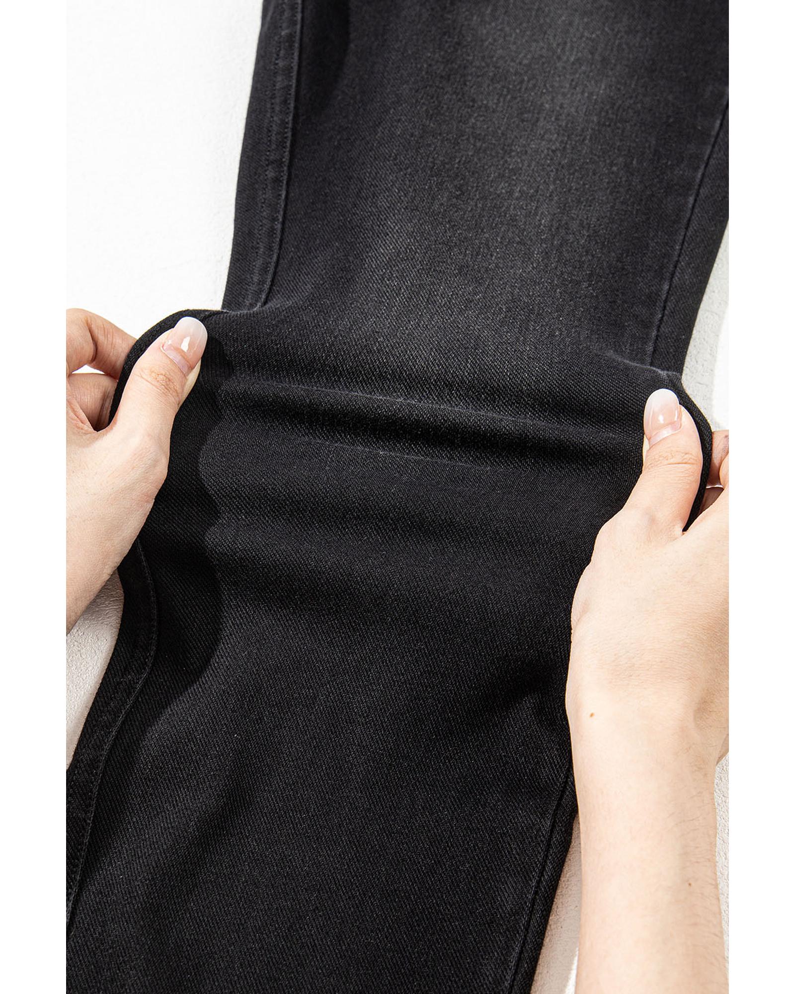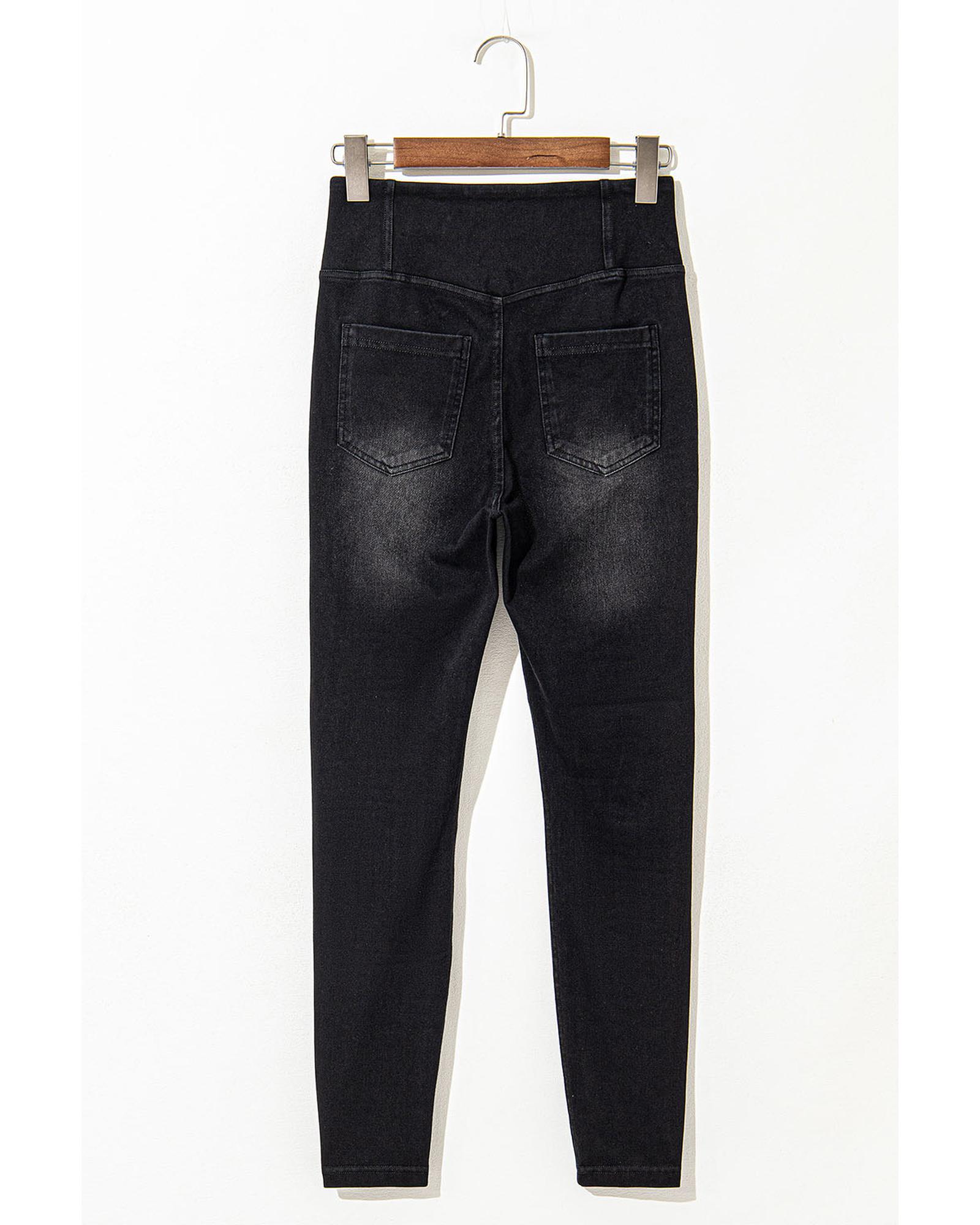 This pair of black arched waist jeggings features a stretchy, slim fit design that accentuates your curves while providing all-day comfort. The unique cross waist adds a stylish touch, making these jeggings suitable for everyday wear. They include convenient side pockets for storage and are crafted from a comfortable blend of polyester, cotton, and elastane.