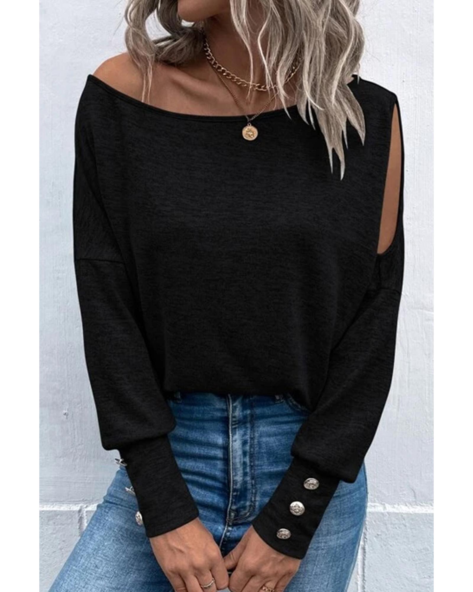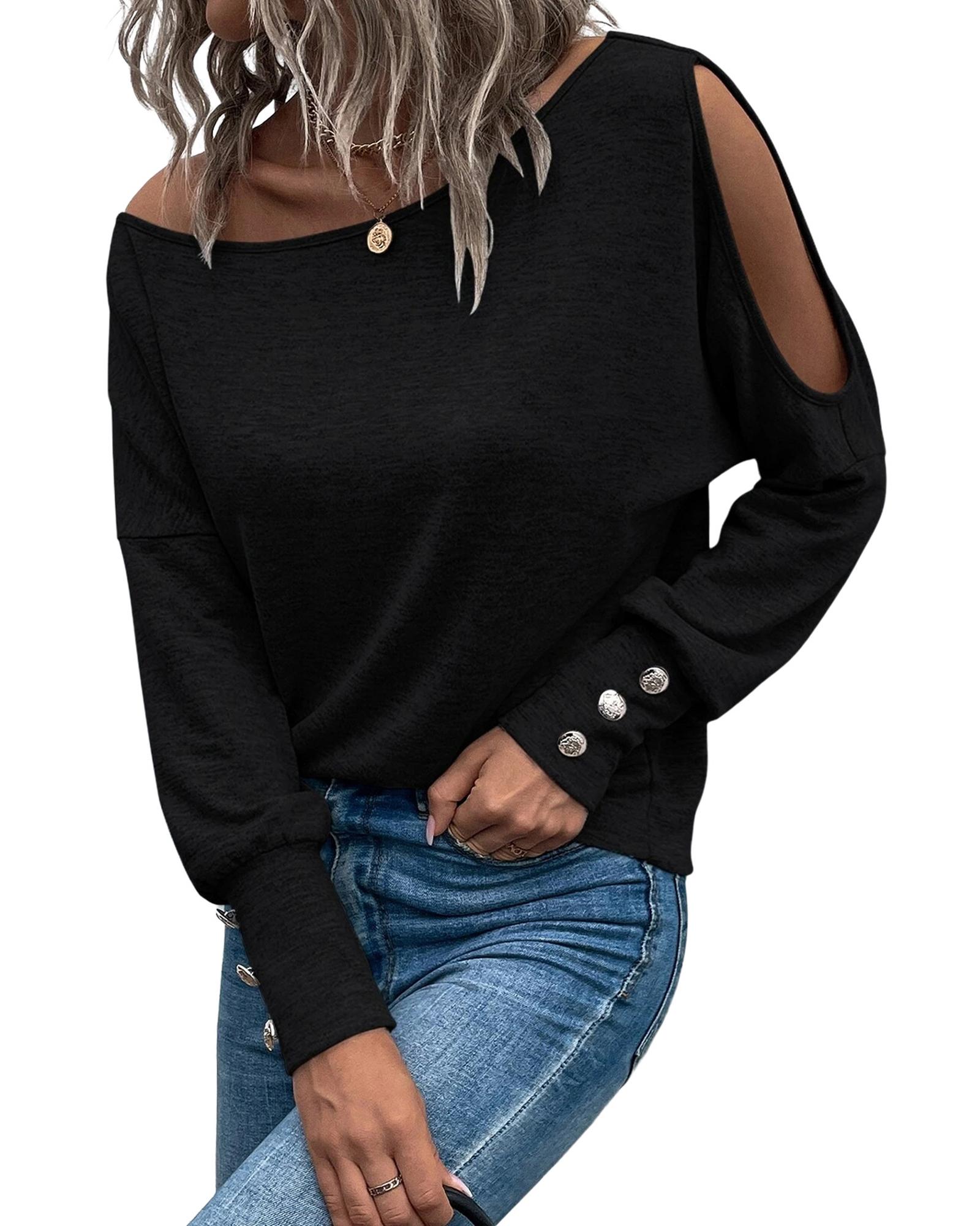 This asymmetrical cut-out buttoned long sleeve top features a unique design with a solid color that complements any outfit. Its trendy fitted style offers a chic and casual look, making it suitable for various occasions. The top is designed for easy movement and comfort, combining fashion with functionality.