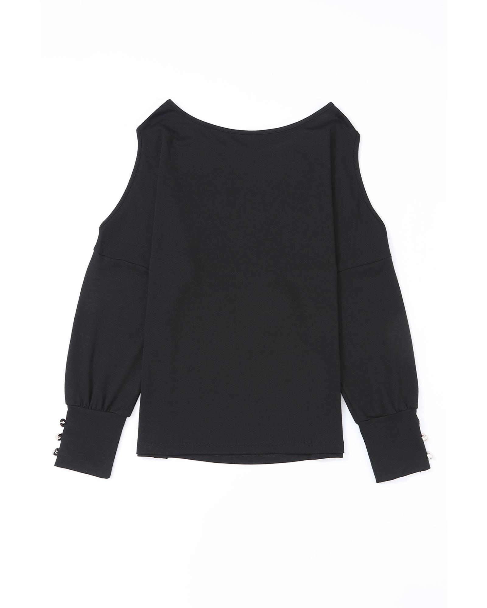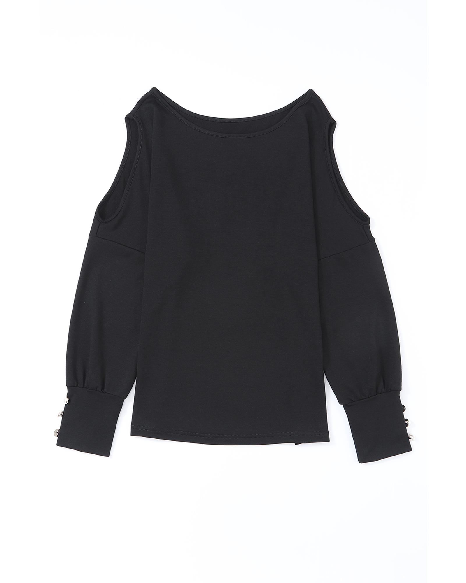 This asymmetrical long sleeve top features a unique cut-out design with button details, offering a stylish and modern look. Its solid color makes it versatile for various outfits, combining casual comfort with chic sophistication.