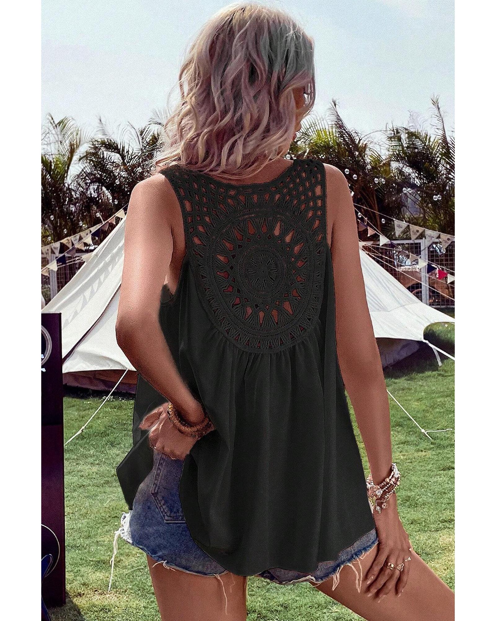 This sleeveless tunic features a trendy bohemian crochet patchwork design with a flowy A-line silhouette, making it a stylish choice for vacation or casual wear. Its versatile look can be paired with denim shorts or other casual bottoms for a relaxed, inspired appearance.
