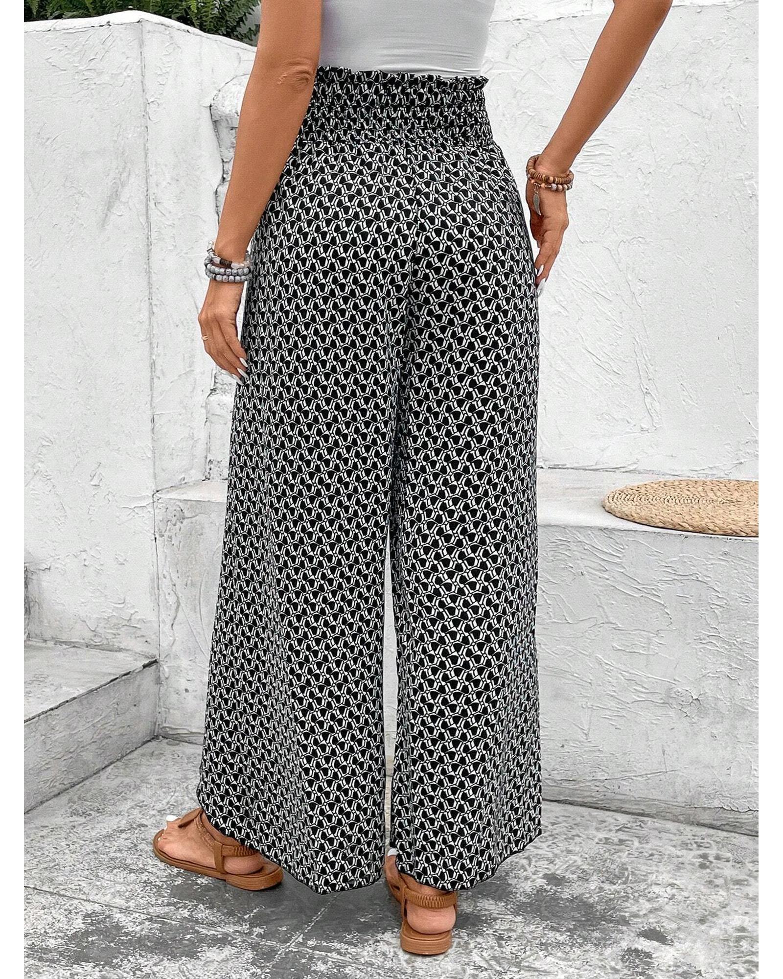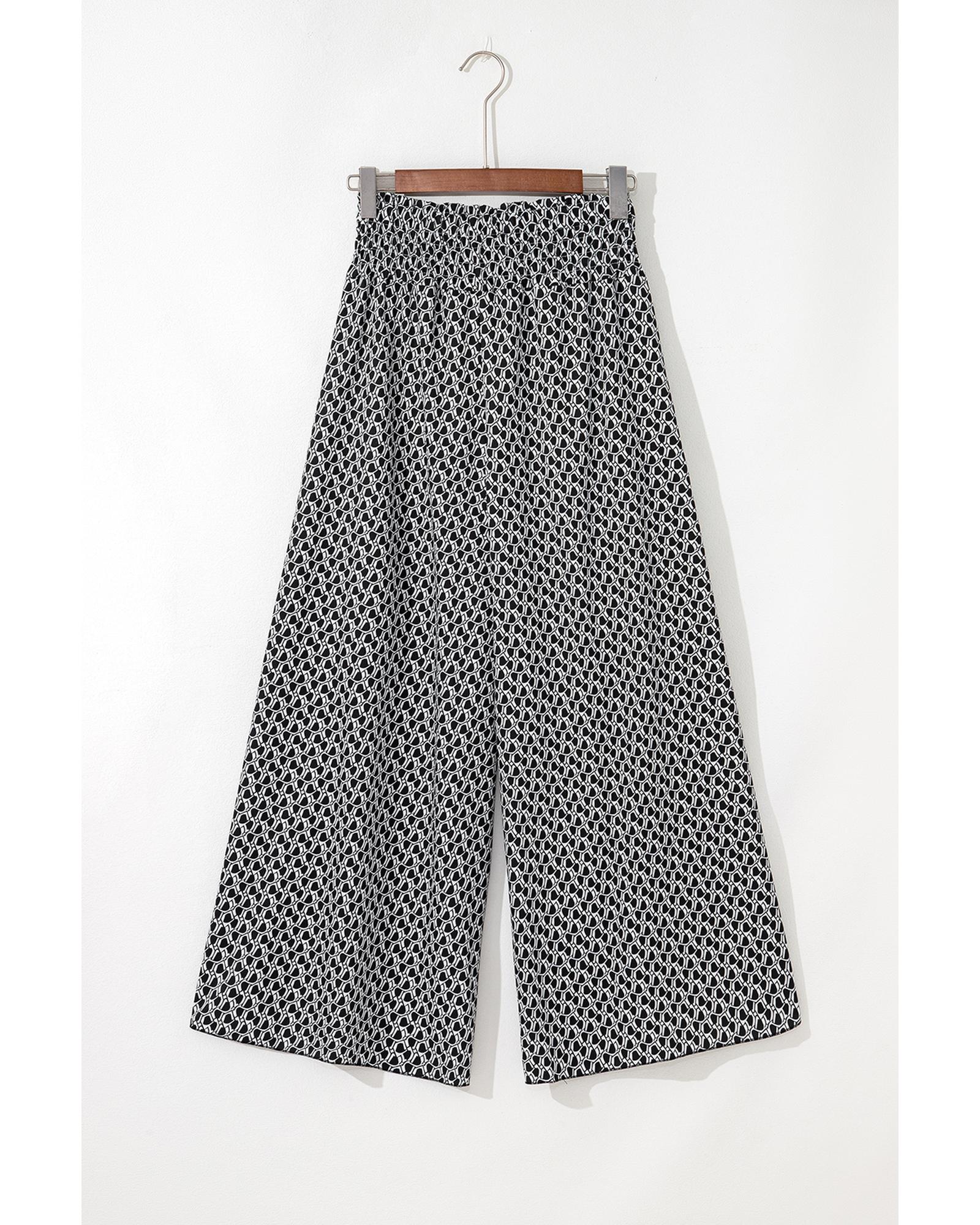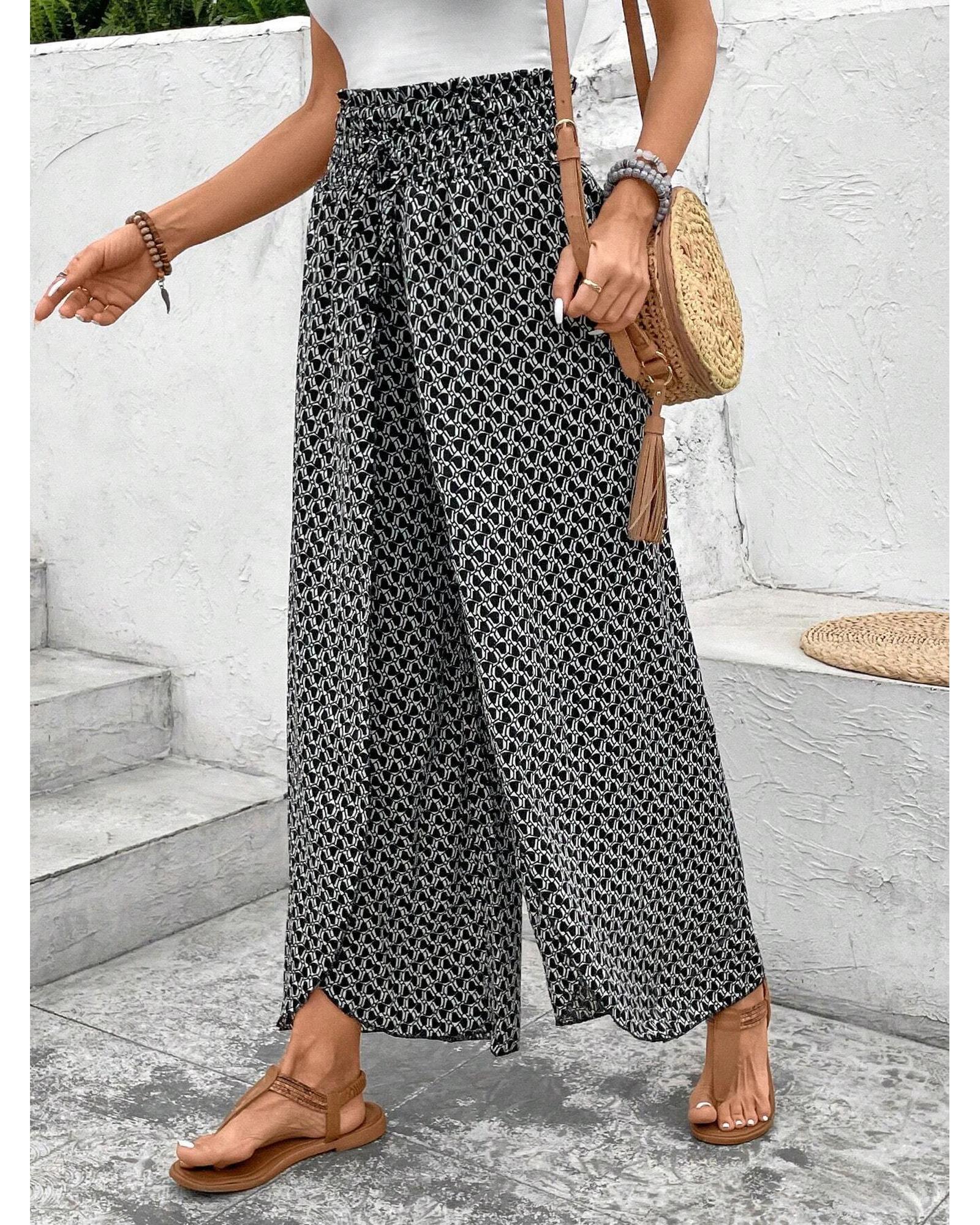 These black bohemian print slit wide-leg pants feature a high waist and a comfortable smocked design, offering a stylish and flowy silhouette. The unique print adds a trendy touch, making them suitable for various casual and fashionable outfits.