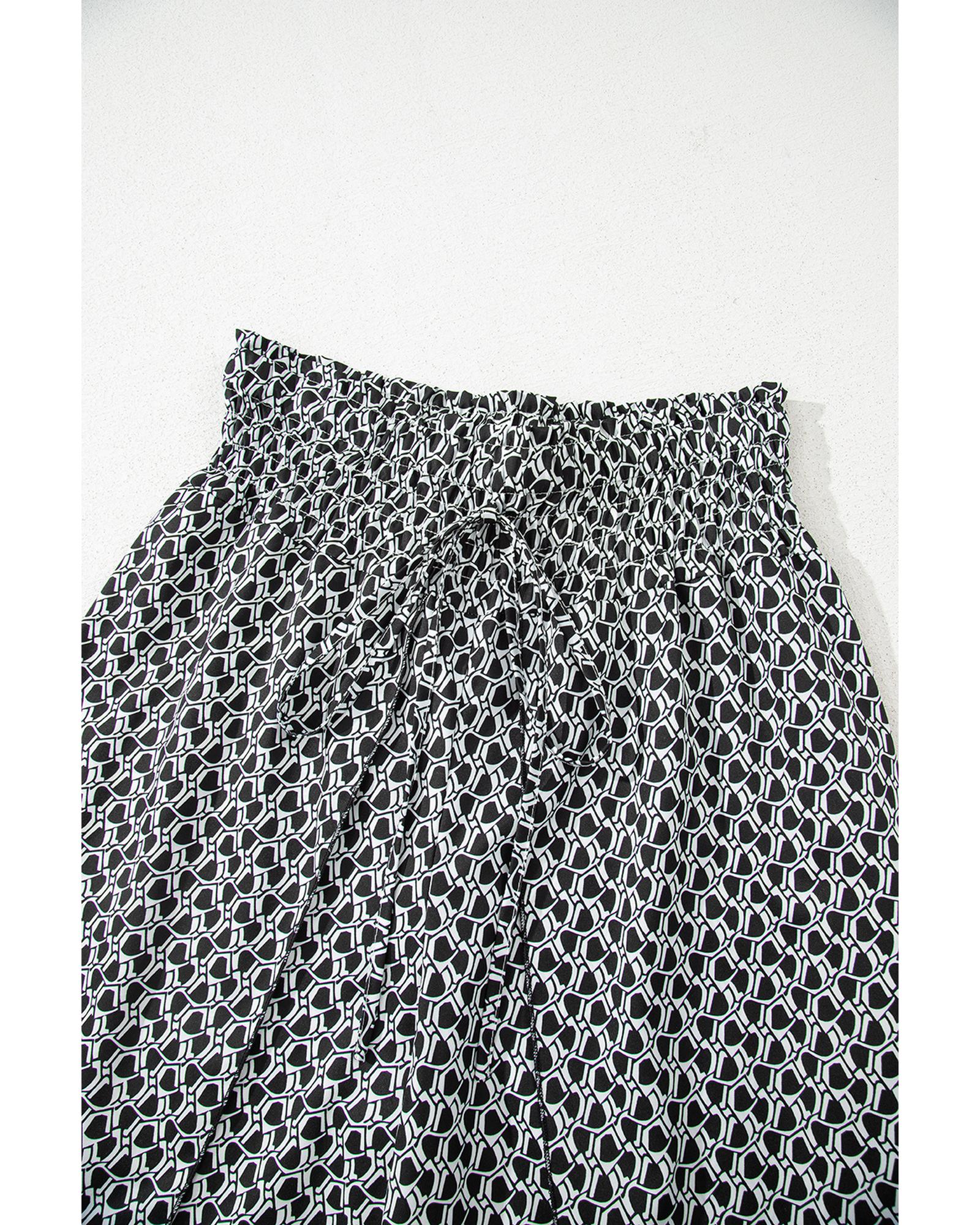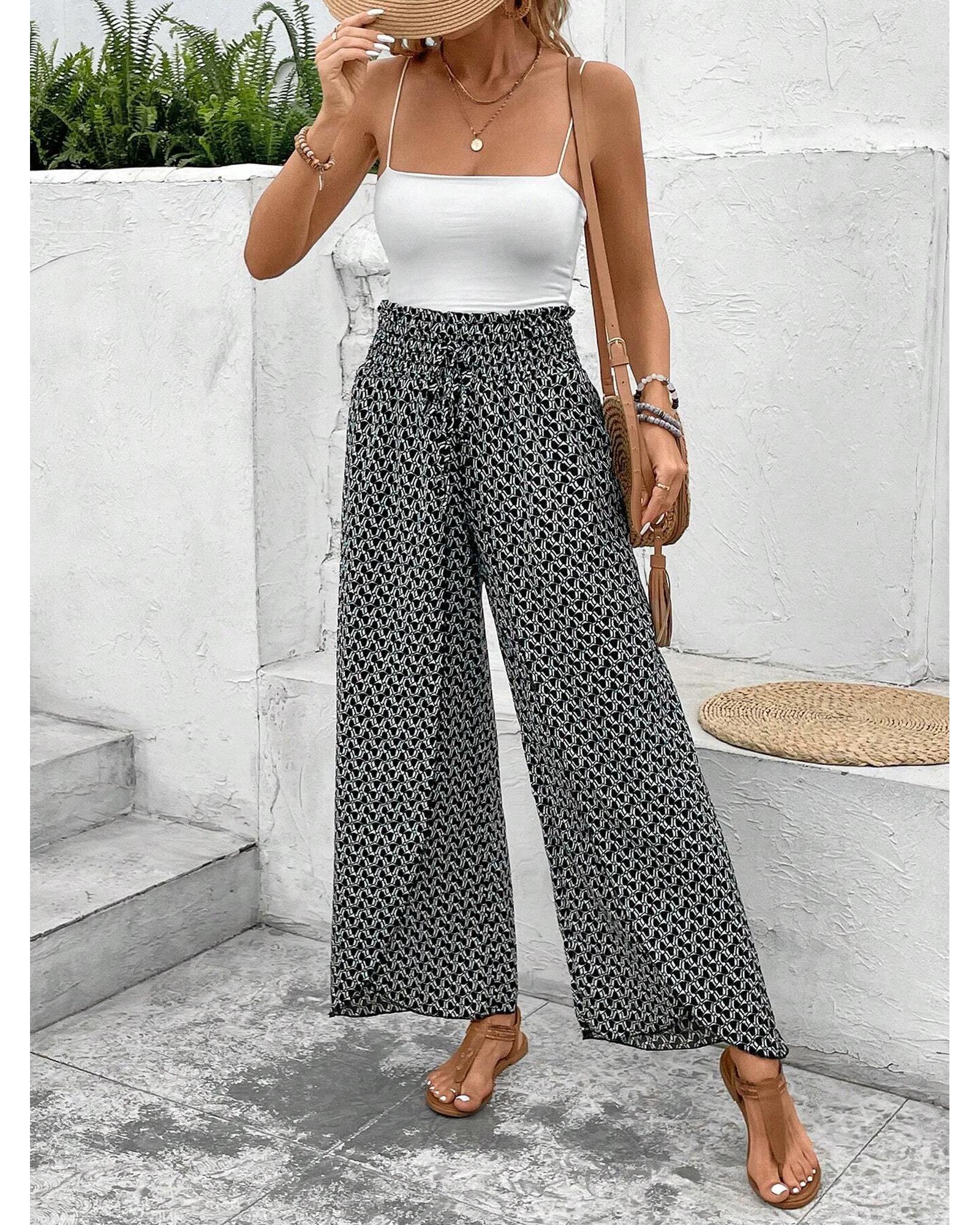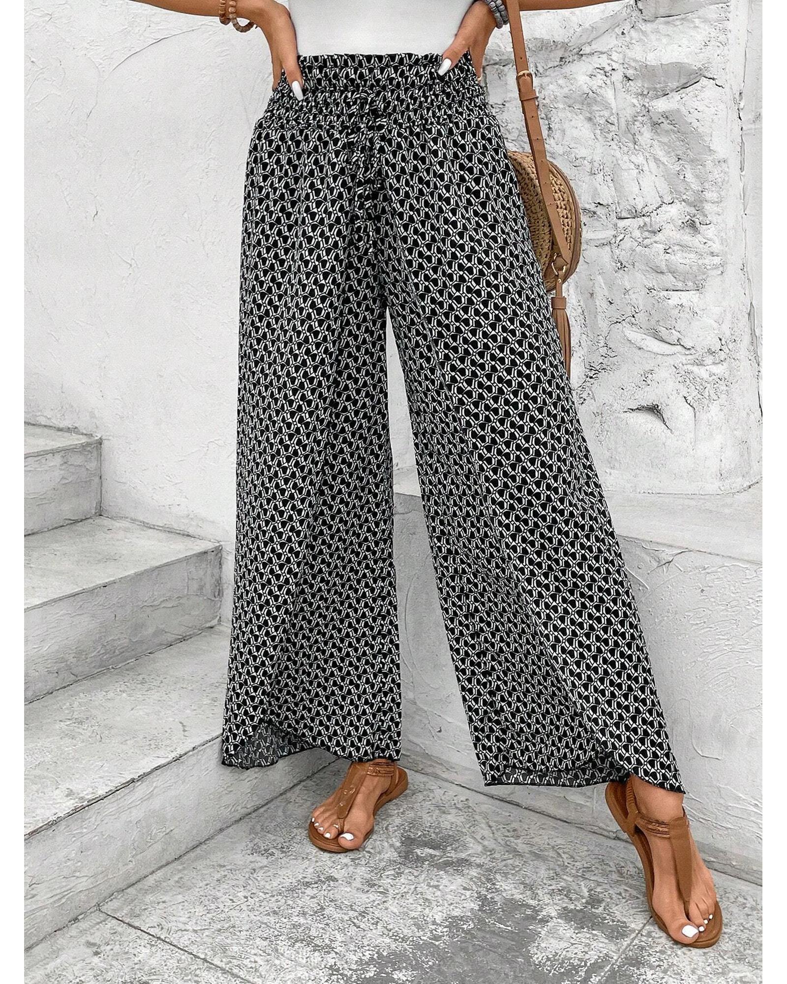 These black bohemian print slit wide-leg pants feature a high waist and a comfortable smocked design, offering a stylish and flowy silhouette. The unique print adds a trendy touch, making them suitable for various casual and fashionable outfits.