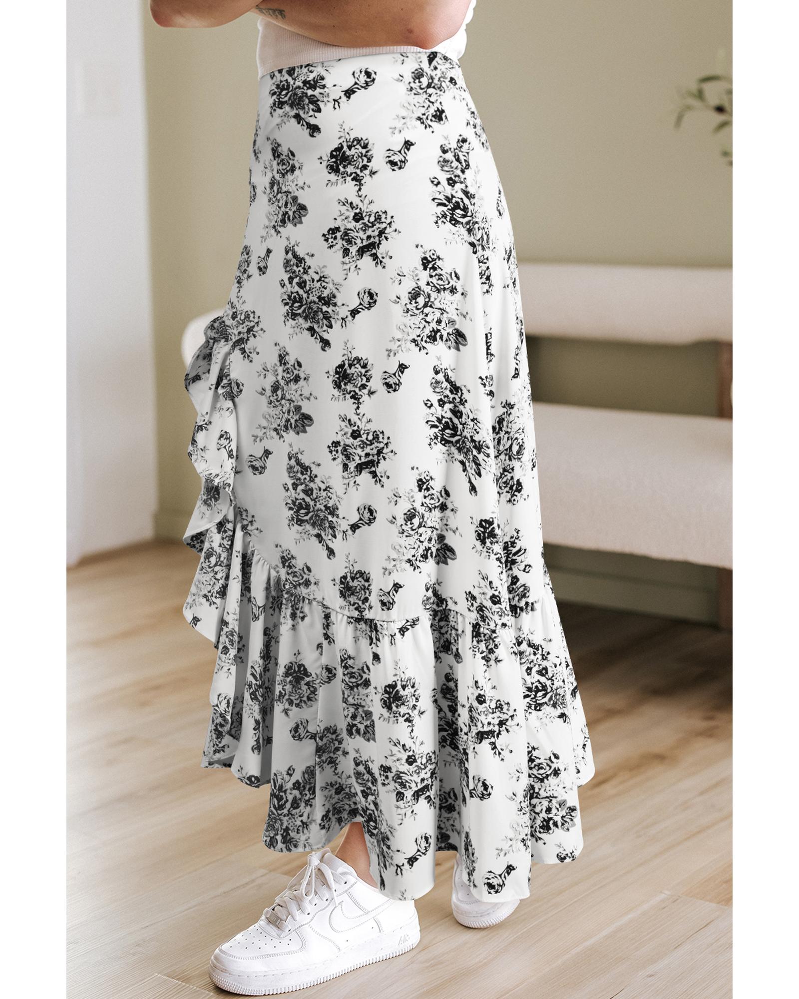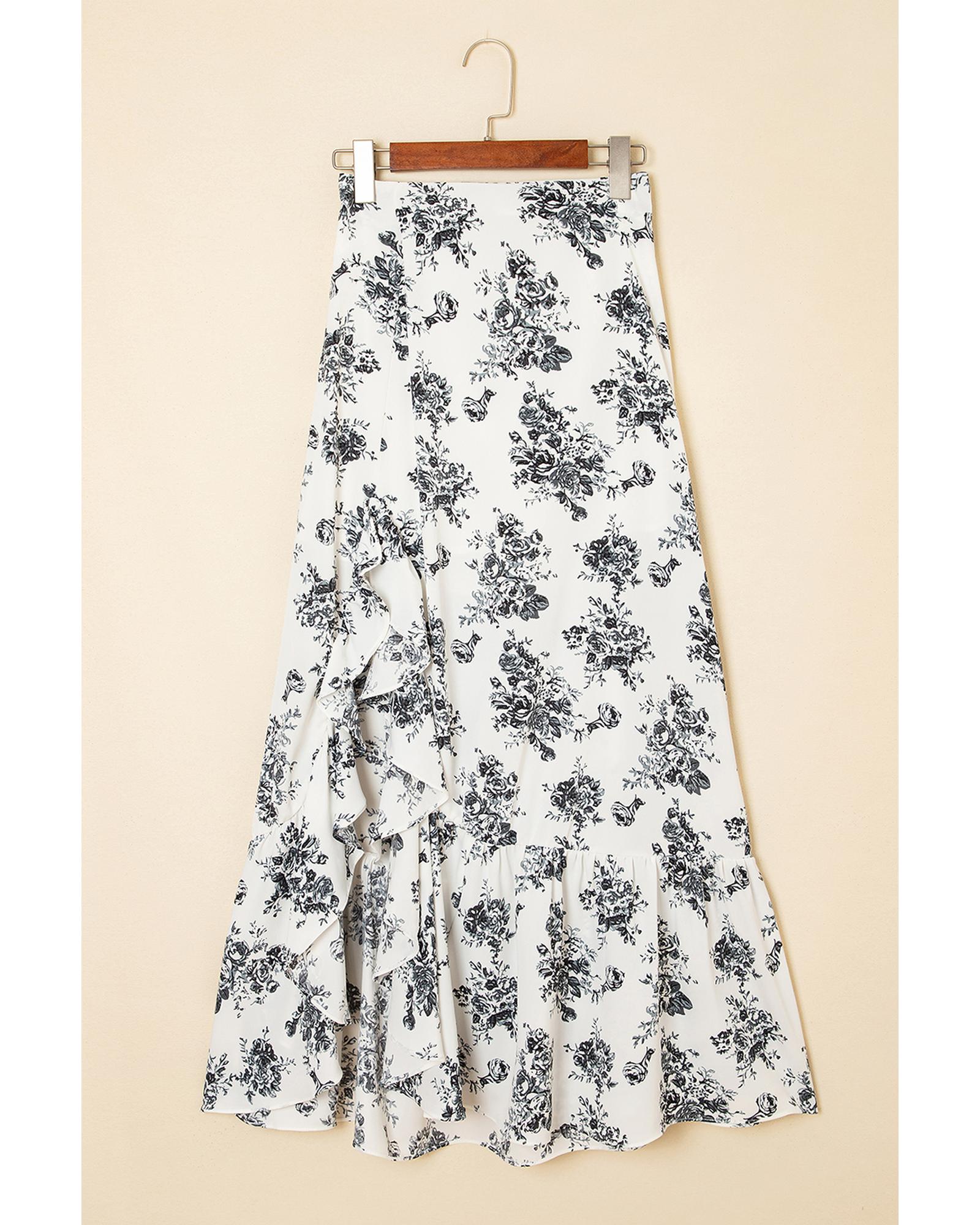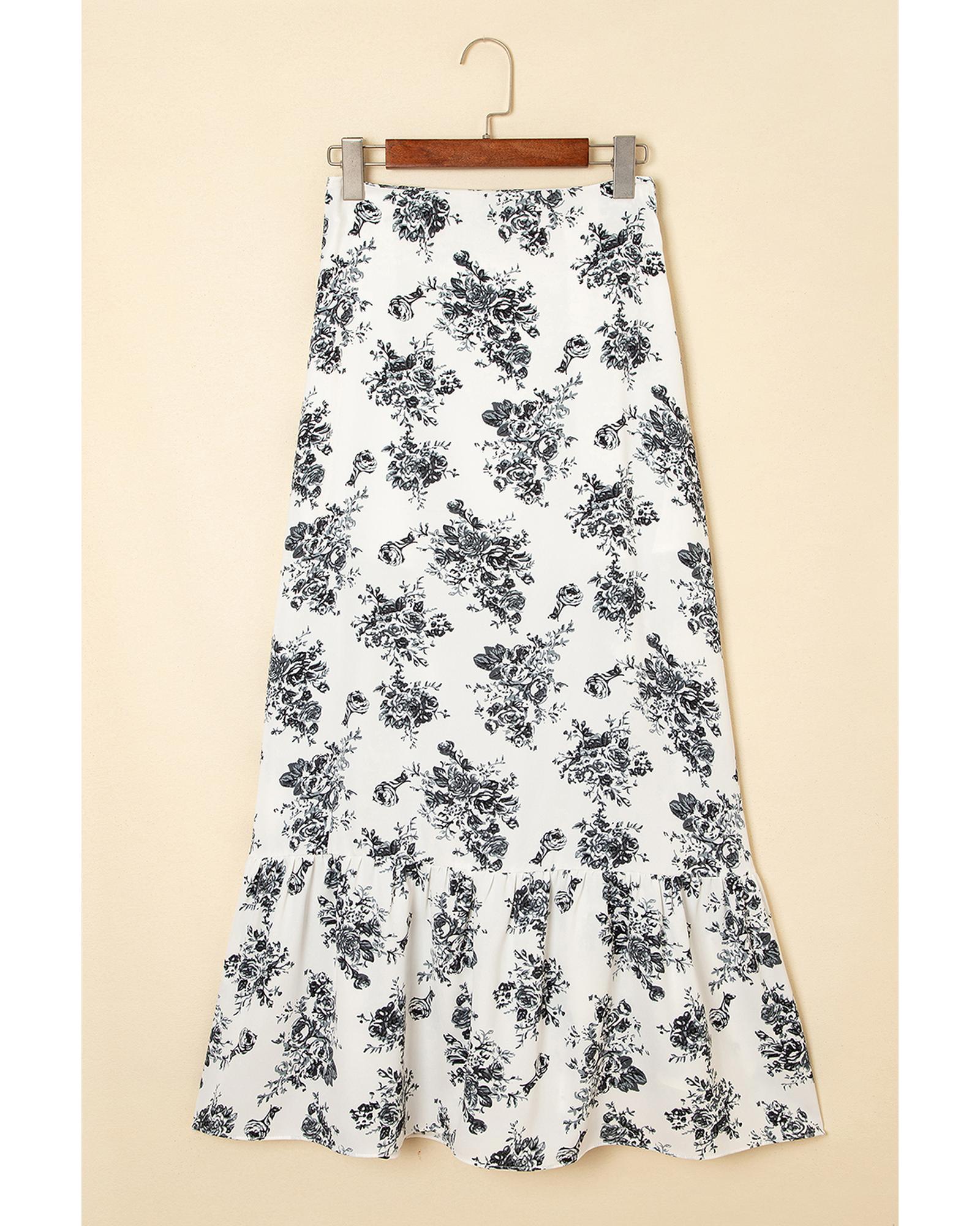 This black boho floral high waist ruffle split maxi skirt offers a stylish and elegant addition to your wardrobe. Its high waist design provides a versatile fit, while the floral pattern adds a charming touch. The maxi length creates a graceful silhouette, complemented by a side split with ruffled edges for a playful detail. Perfect for pairing with summer tees and tank tops for a casual yet chic look.