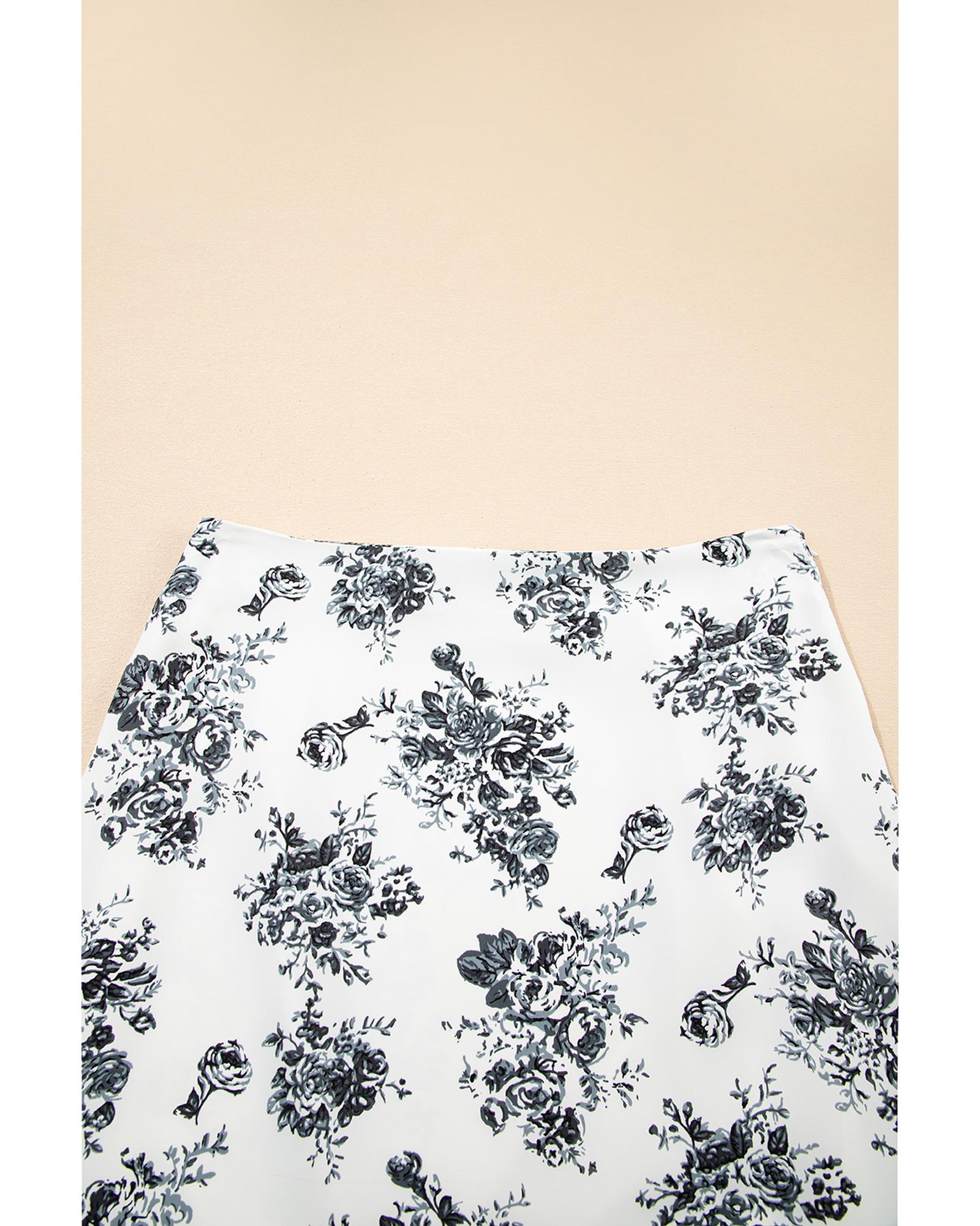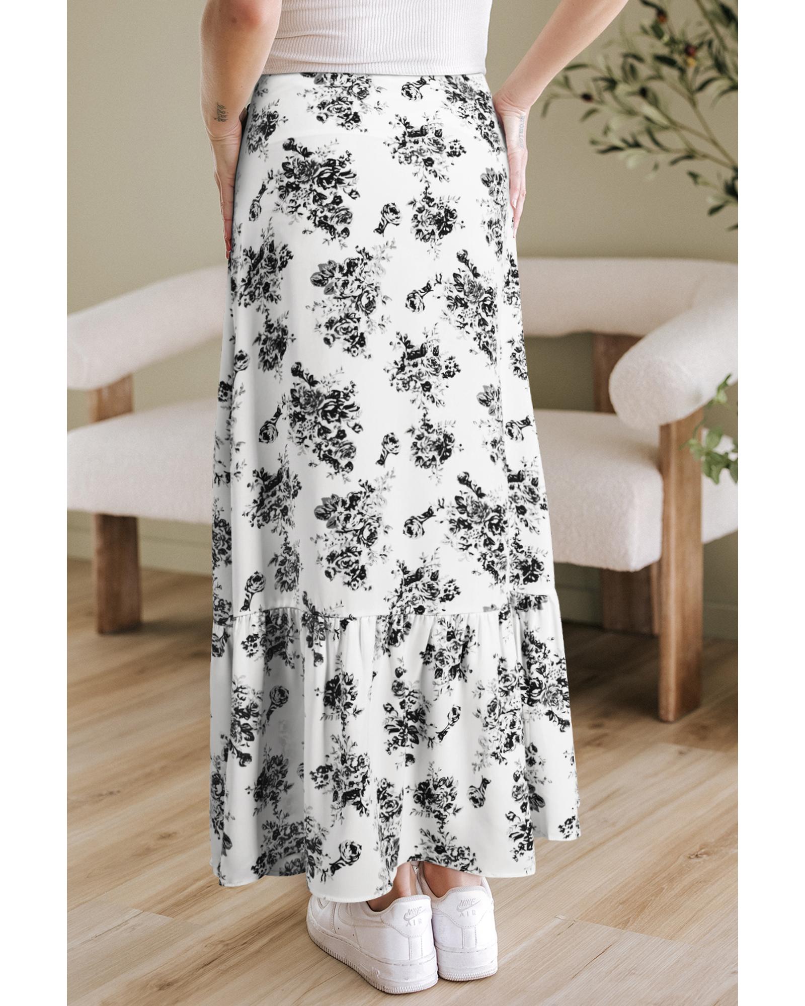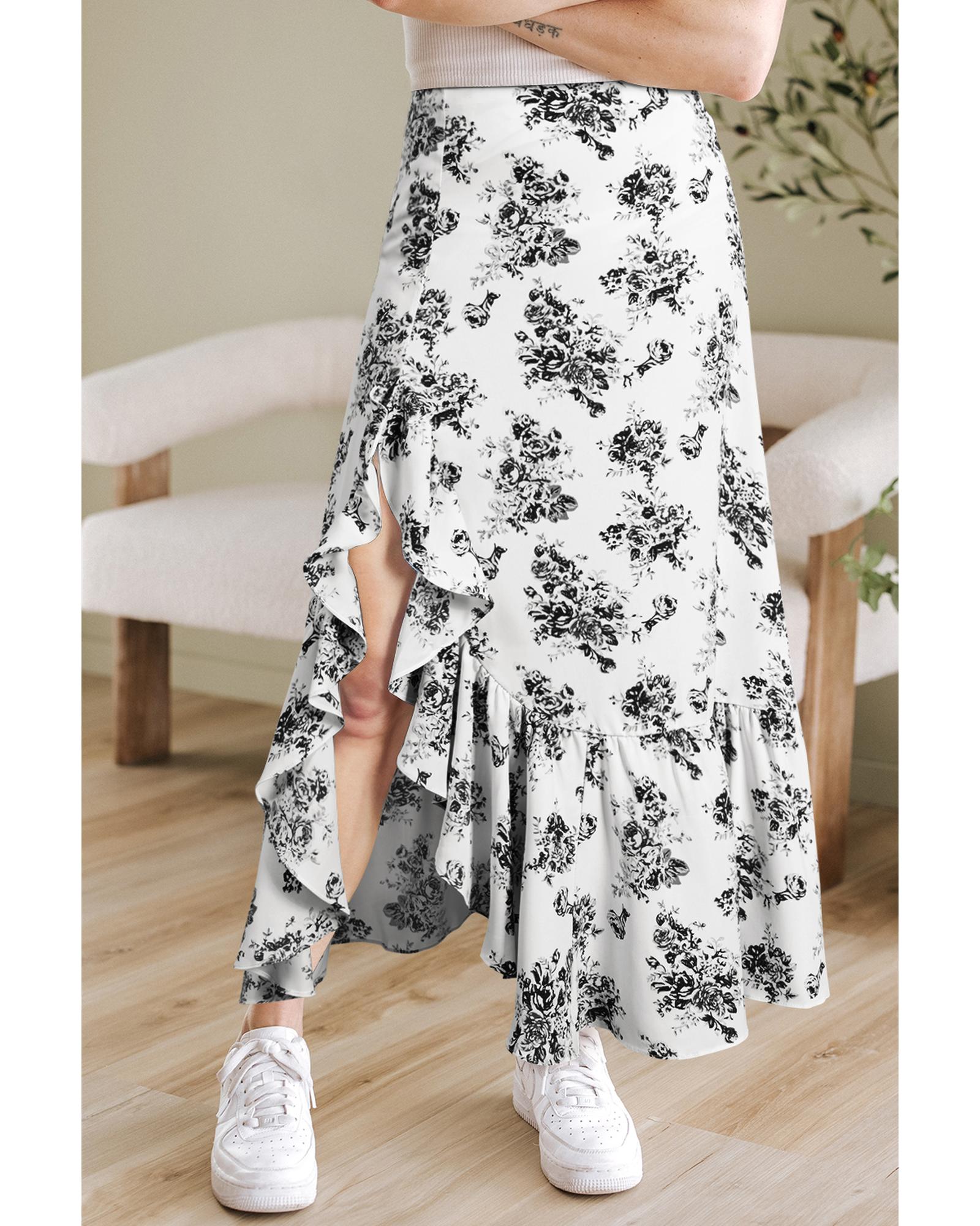 This black boho floral high waist ruffle split maxi skirt offers a stylish and elegant addition to your wardrobe. Its high waist design provides a versatile fit, while the floral pattern adds a charming touch. The maxi length creates a graceful silhouette, complemented by a side split with ruffled edges for a playful detail. Perfect for pairing with summer tees and tank tops for a casual yet chic look.