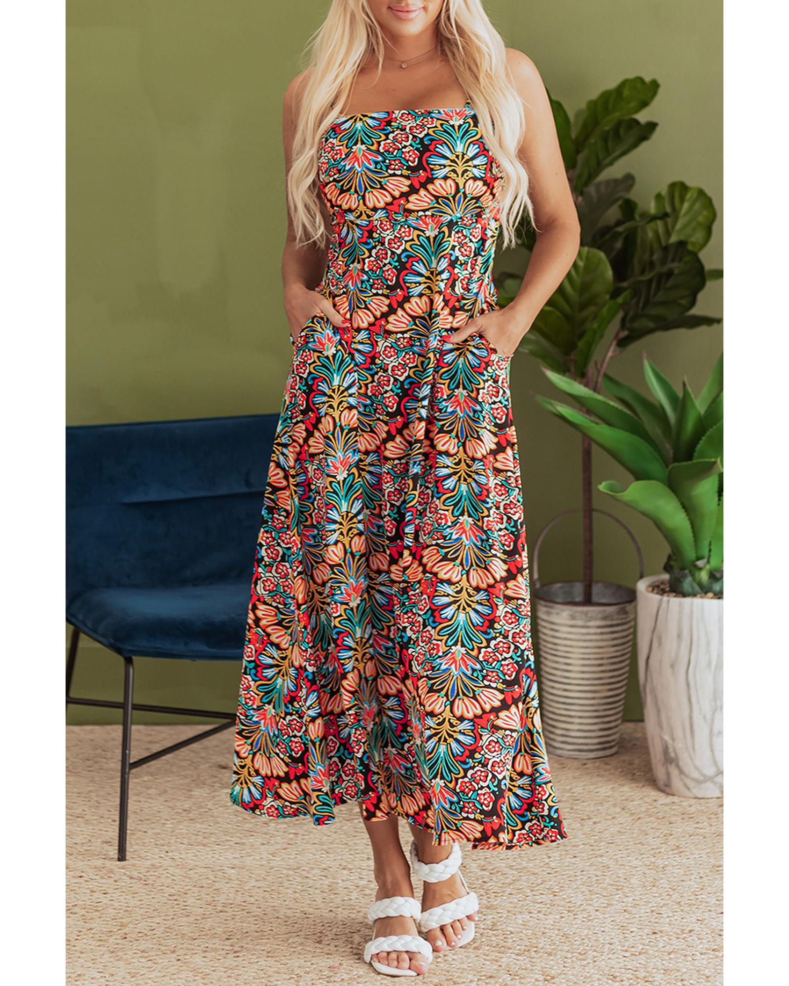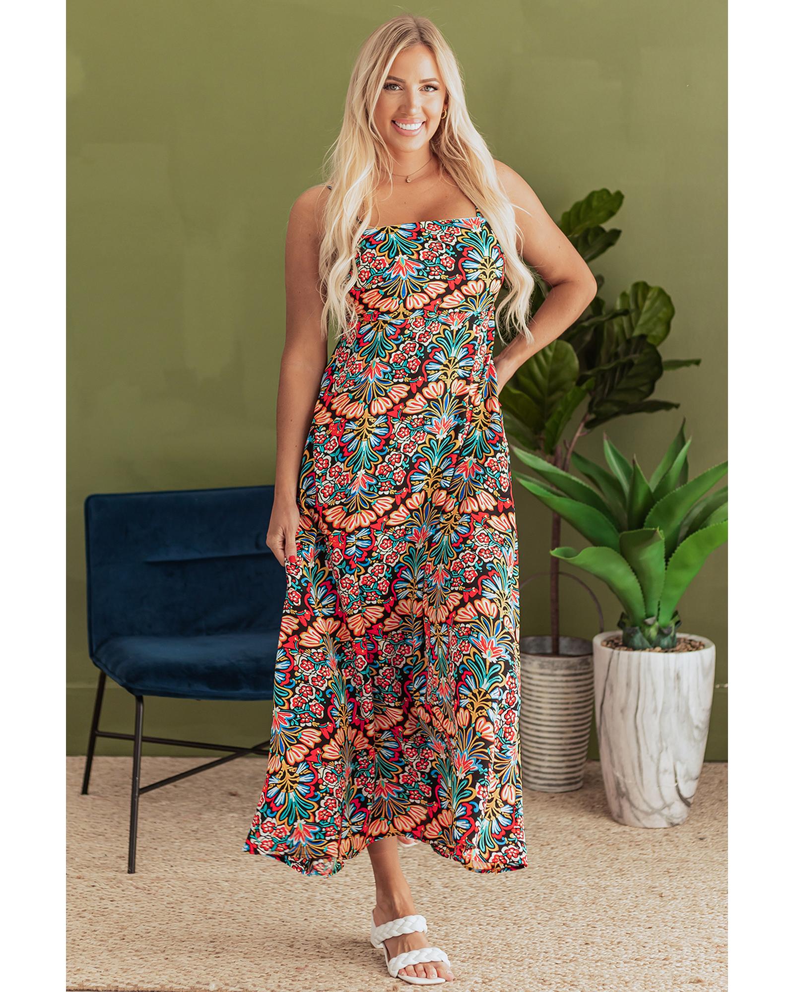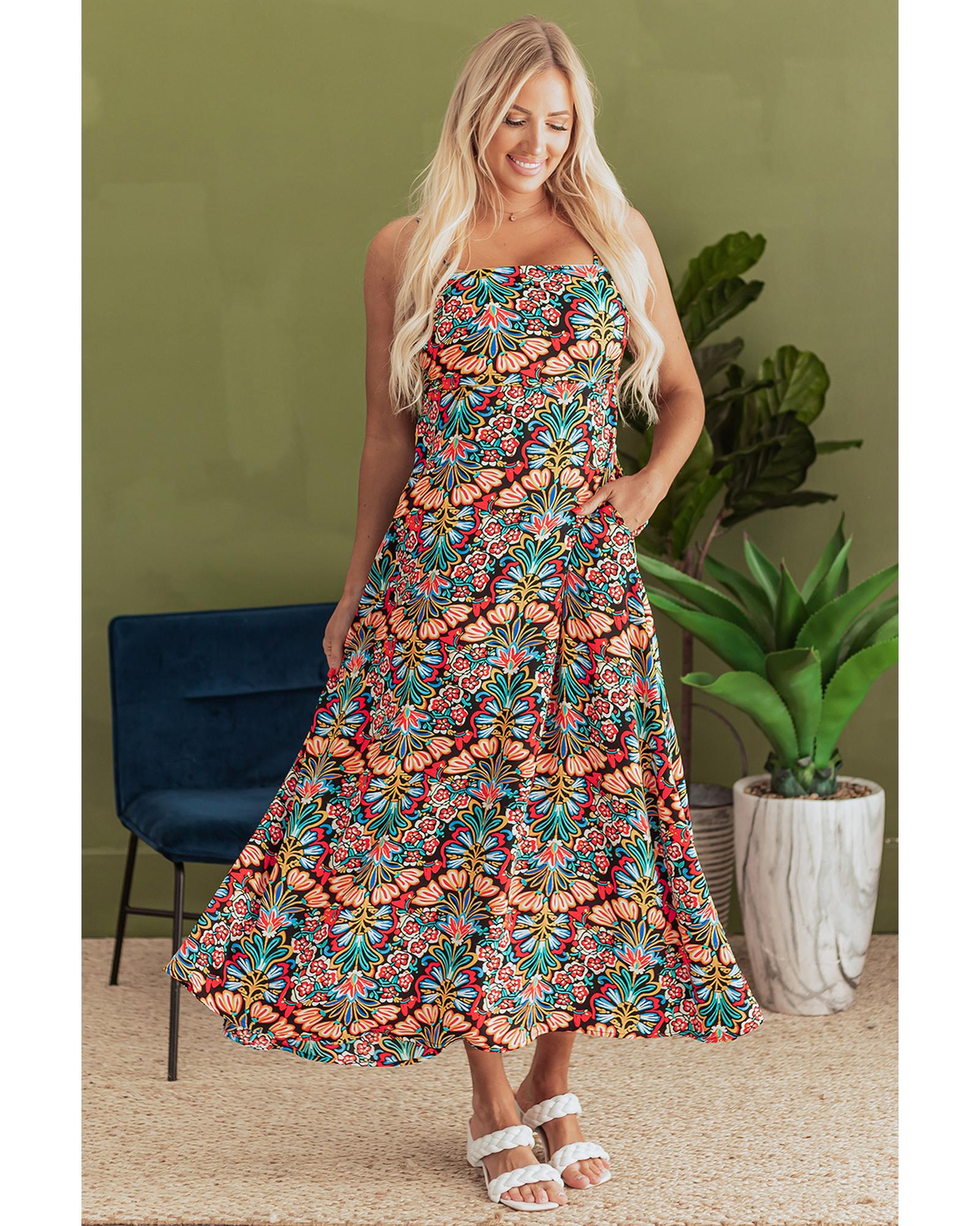 This sleeveless maxi dress features a floral print design with a high waist and thin straps, creating a chic and romantic look suitable for warm weather events. Its flowy silhouette flatters the figure and elongates the overall appearance, making it a versatile choice for various occasions.