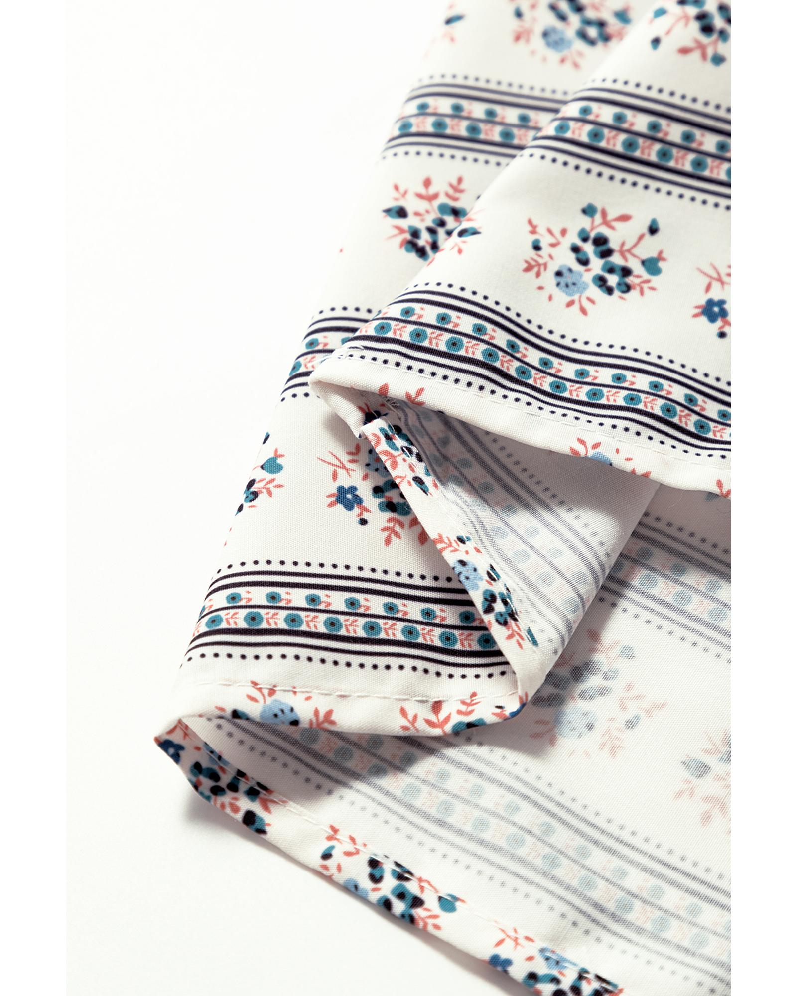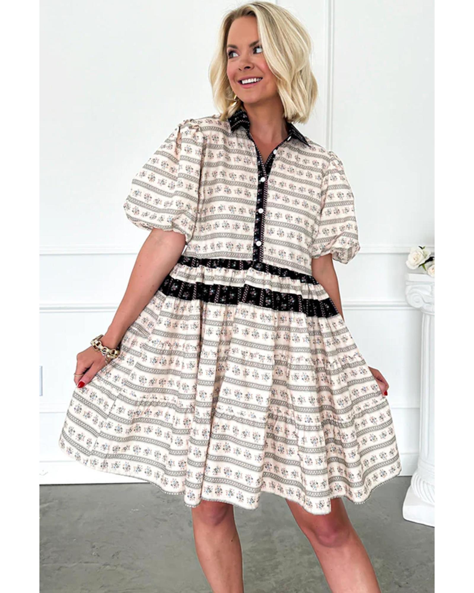 This dress features a stylish combination of floral prints and striped patterns, enhanced by contrasting trim details. The high waist design creates a flattering silhouette, while the trendy bubble sleeves add a playful touch. Crafted from 100% polyester, it offers a fashionable and comfortable fit.