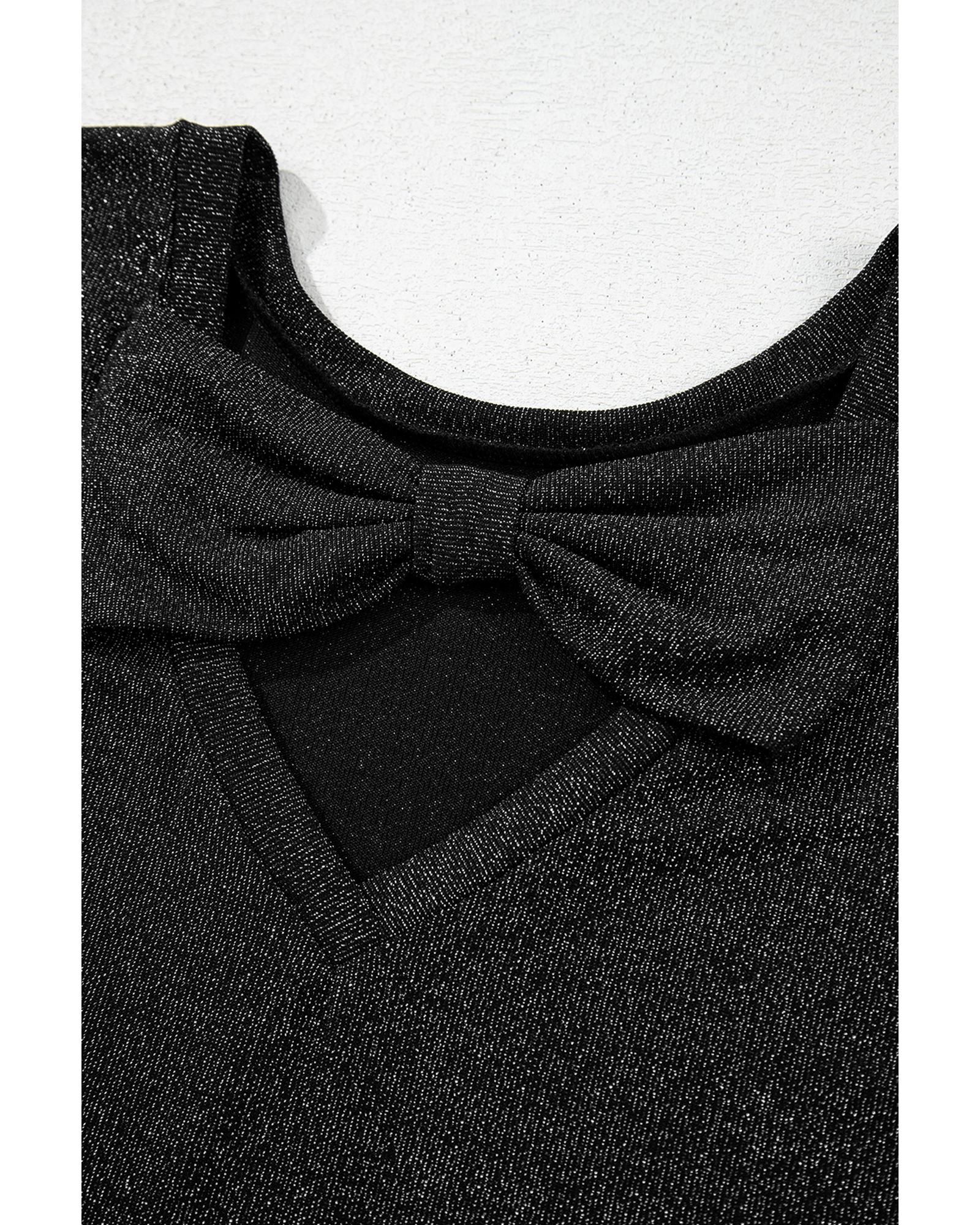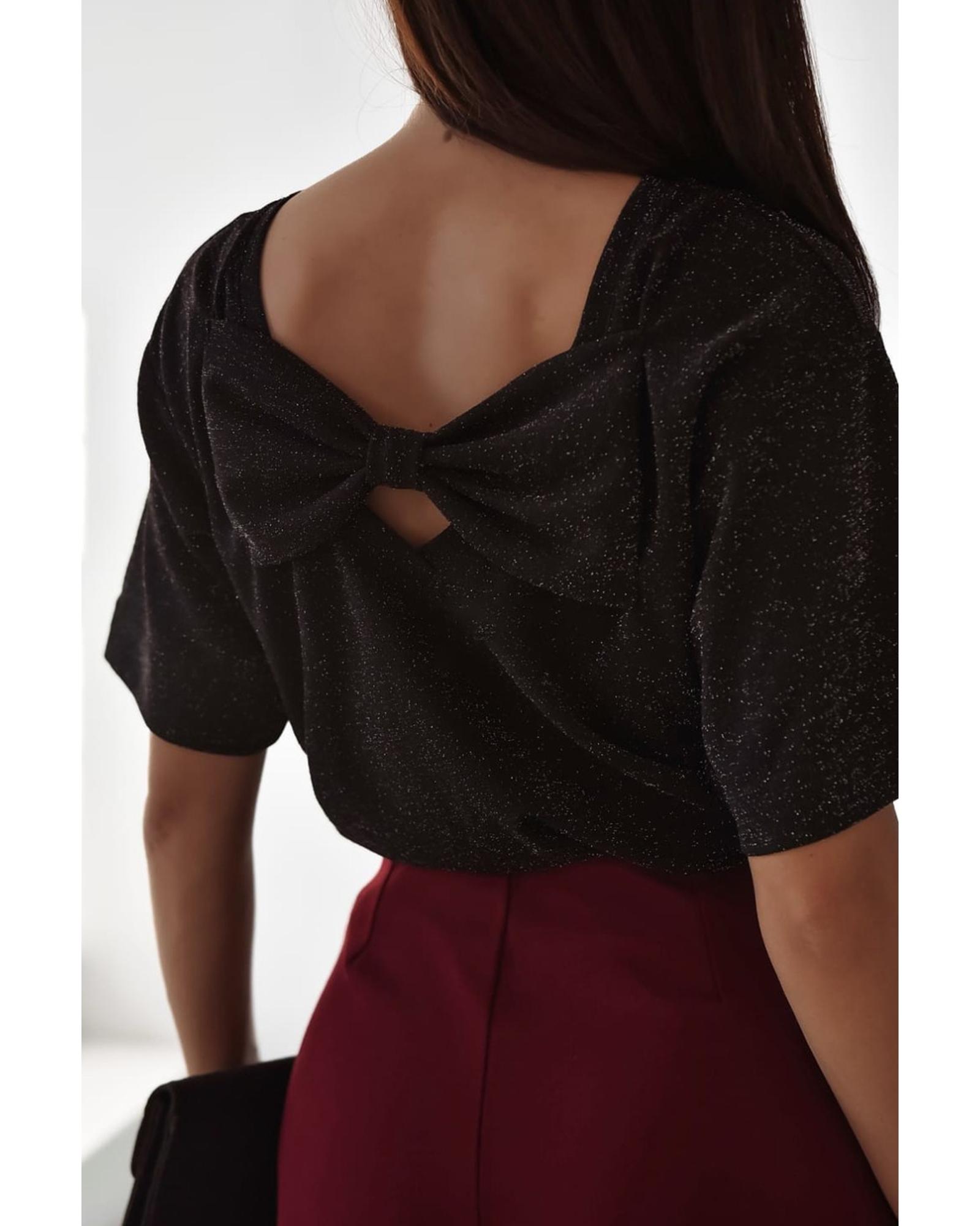 This glittery short sleeve top features a trendy fitted design with a charming bow detail on the back. Made from high-quality shimmering fabric, it offers a glamorous and chic look suitable for various occasions. The top is designed to add sparkle and style to any outfit, making it a versatile addition to your wardrobe.