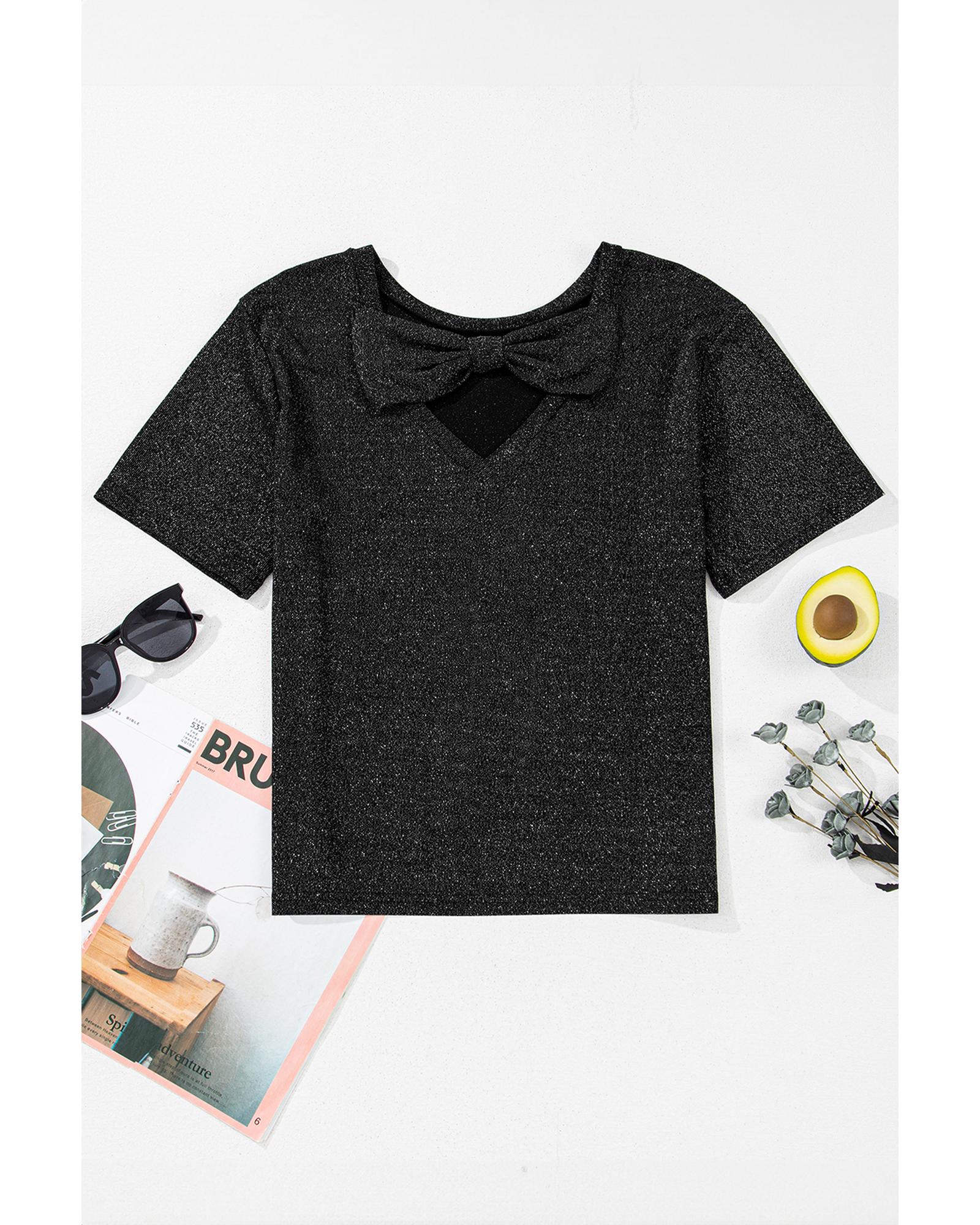 Black Bow Decor Glittery Short Sleeve Top – S