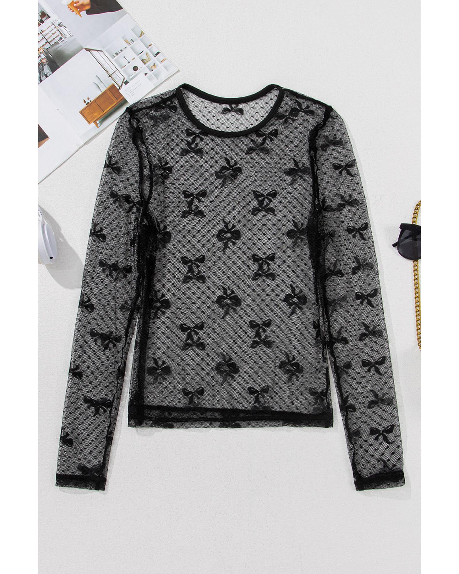 This long sleeve top features a stylish black bow pattern accent and sheer mesh sleeves, making it a versatile addition to any wardrobe. Designed with a trendy fitted silhouette, it offers a delicate and charming look suitable for both day and night wear. Crafted from comfortable and breathable mesh fabric, it ensures ease of wear throughout the day.