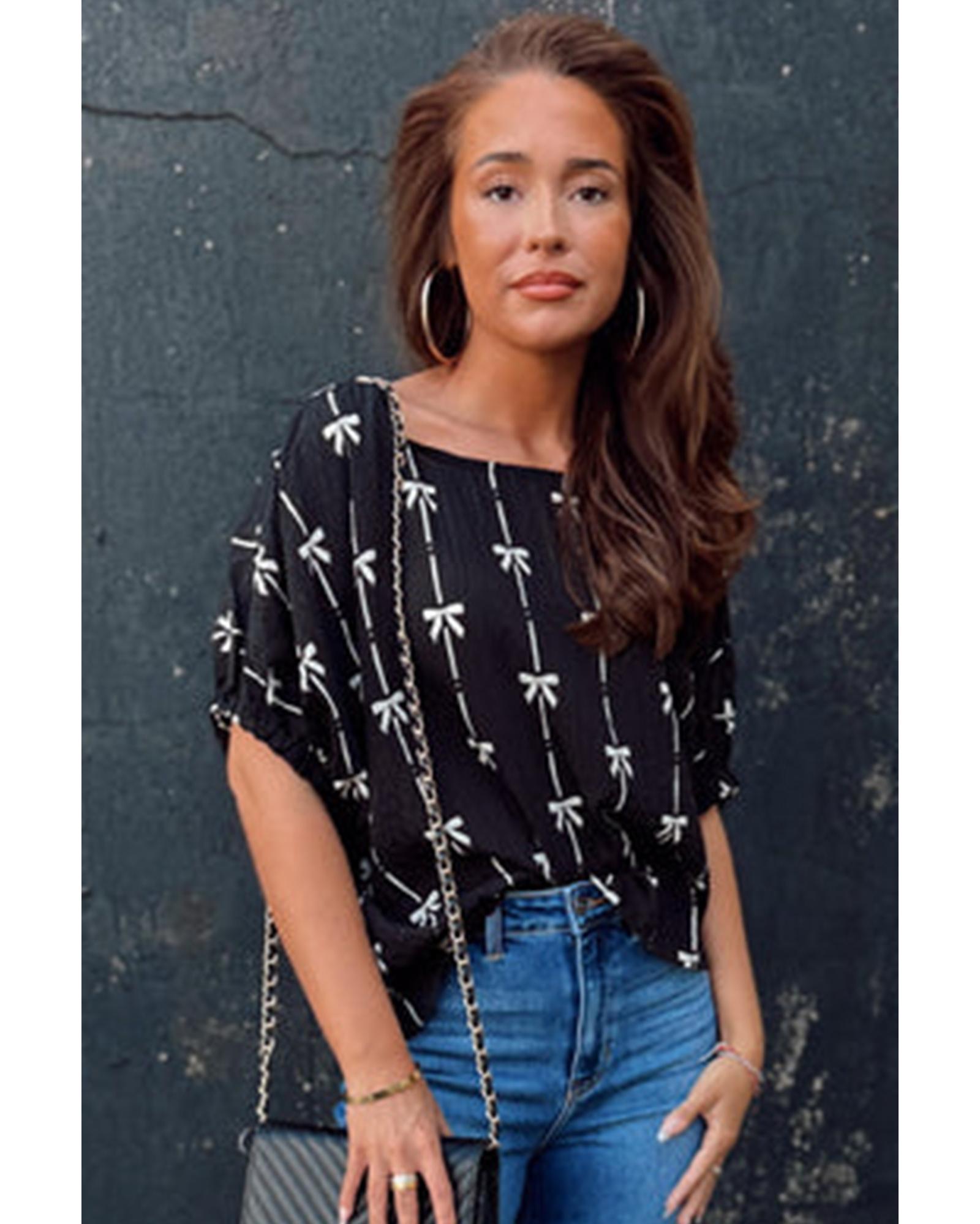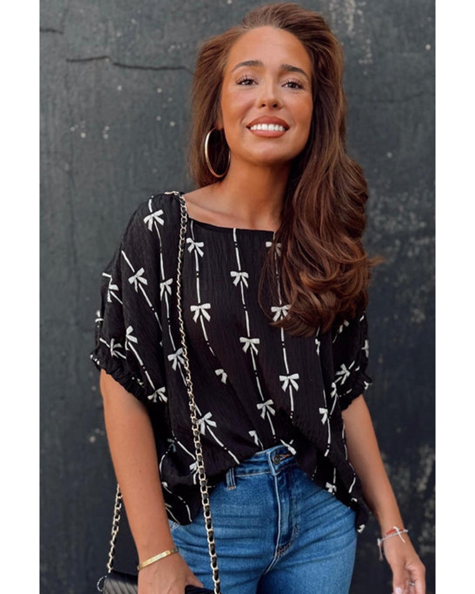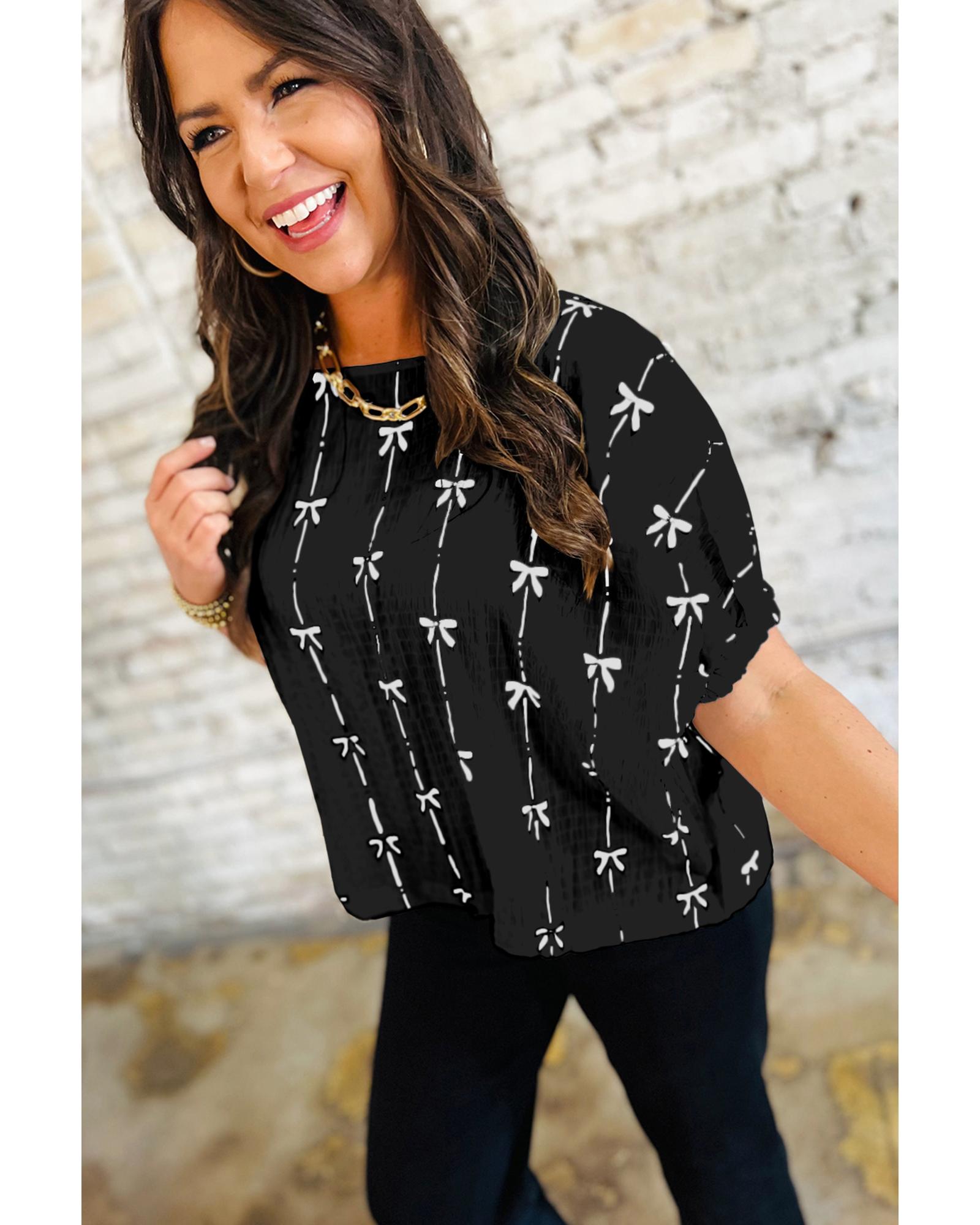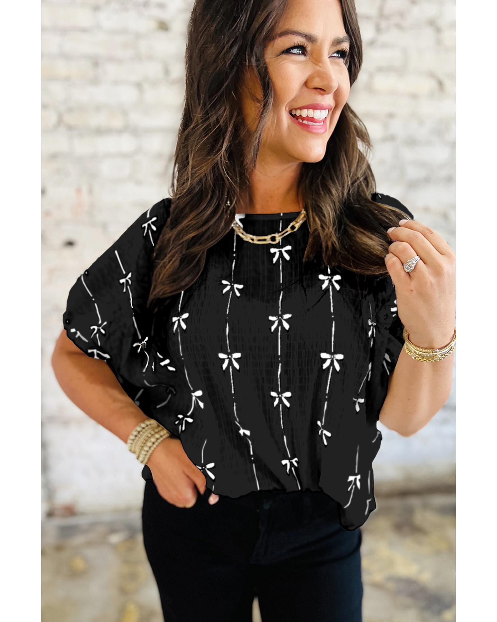 This puff short sleeve top features a charming black bow print and trendy puff sleeves, making it a versatile addition to any wardrobe. Crafted from soft and breathable fabric, it offers all-day comfort and a stylish look that can be paired easily with skirts or jeans.