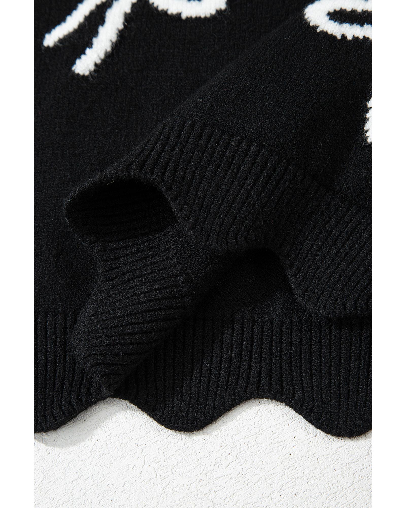 Black Bow Print Side Ties Scalloped Hem Sweater T Shirt – XL