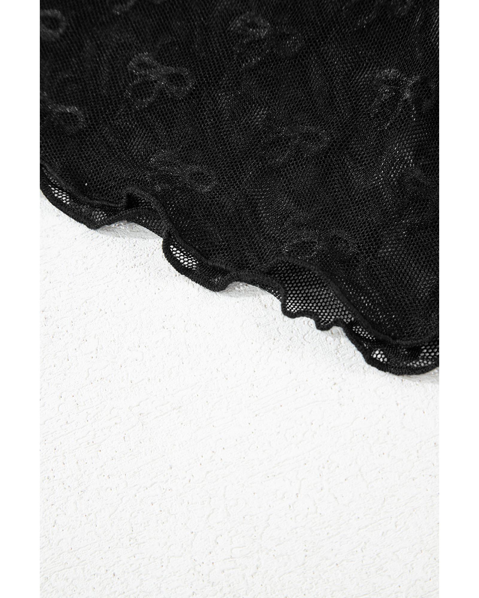 Black Bowknot Sheer Mesh Mock Neck Lettuce Trim Short Sleeve Top – L