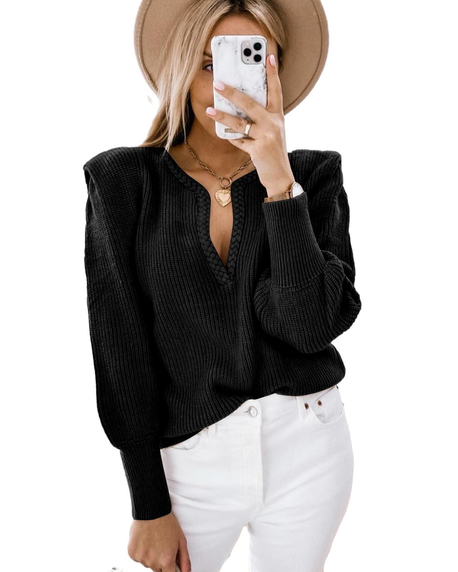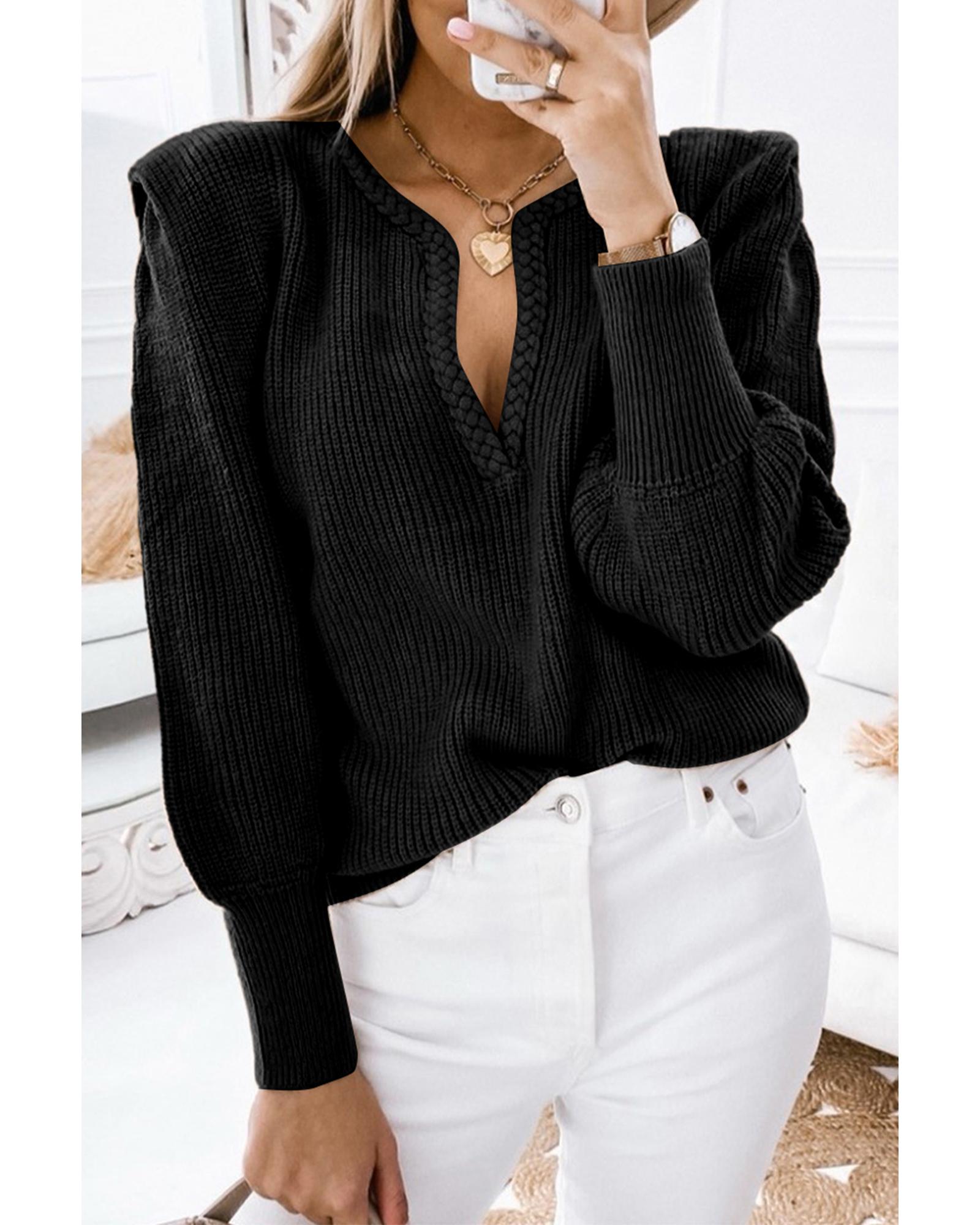 This black knitted sweater features a stylish braided design with a notched V neckline and voluminous puff sleeves. Crafted from high-quality materials, it offers a trendy fitted look that is versatile and easy to style for various occasions.