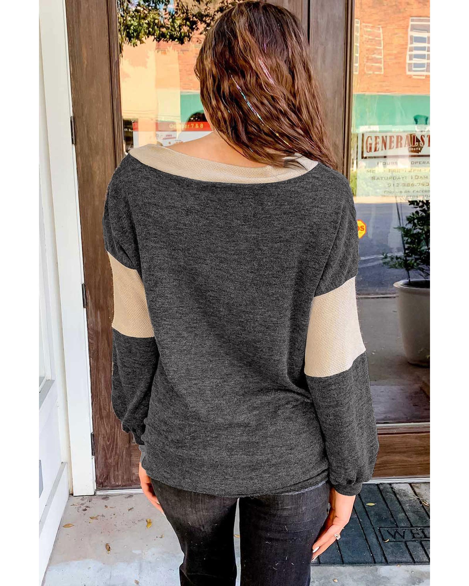 This long sleeve top features a stylish colorblock design with a contrasting brushed knit fabric, offering a trendy and flattering look. Its V neckline adds a touch of elegance, making it suitable for various casual and semi-formal occasions. Designed with a fitted silhouette, it provides a comfortable yet fashionable fit that pairs well with jeans or sweatpants.