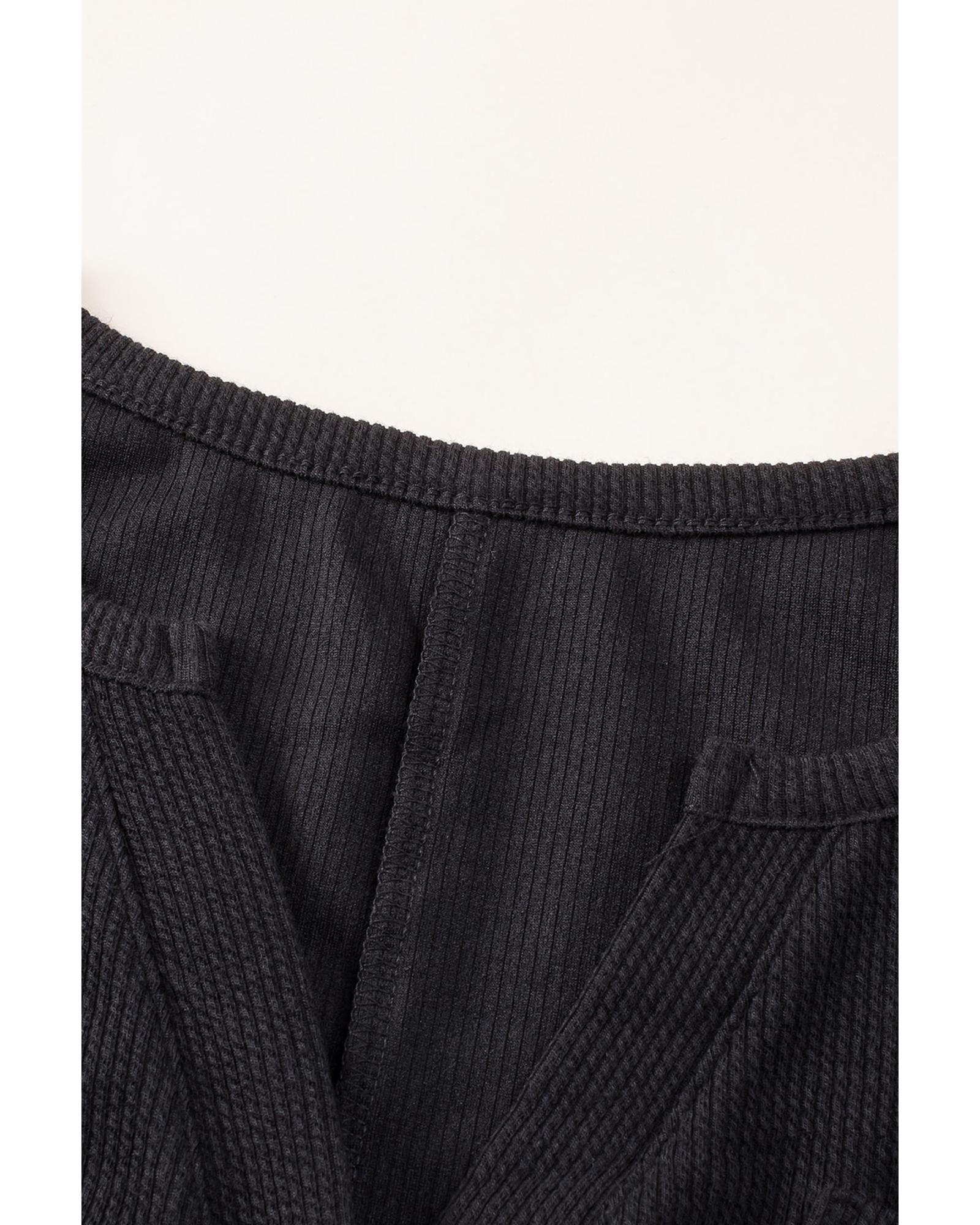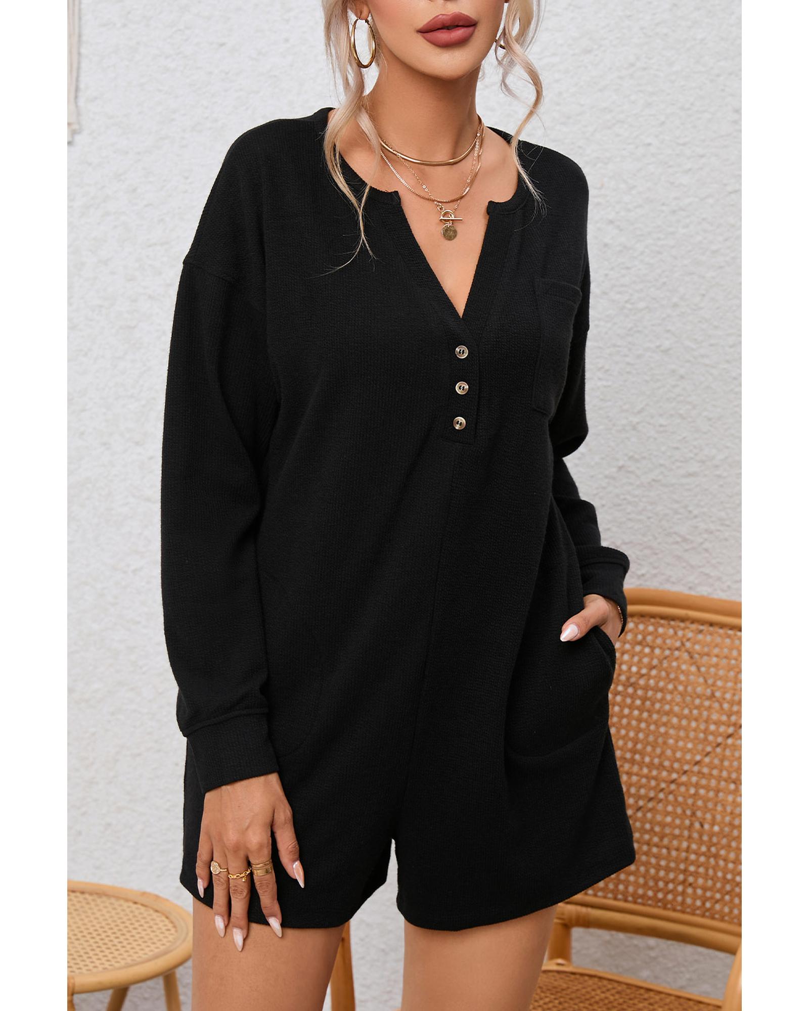 Black Brushed Ribbed Button Split V Neck Long Sleeve Romper – L