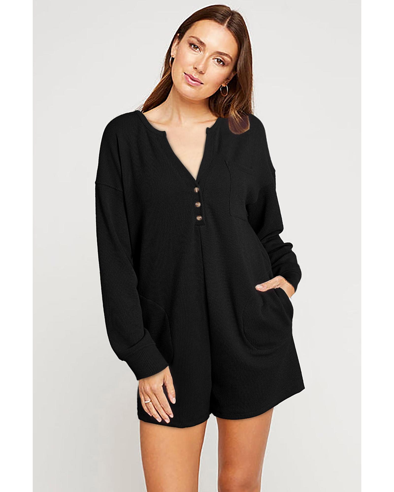 Black Brushed Ribbed Button Split V Neck Long Sleeve Romper – XL