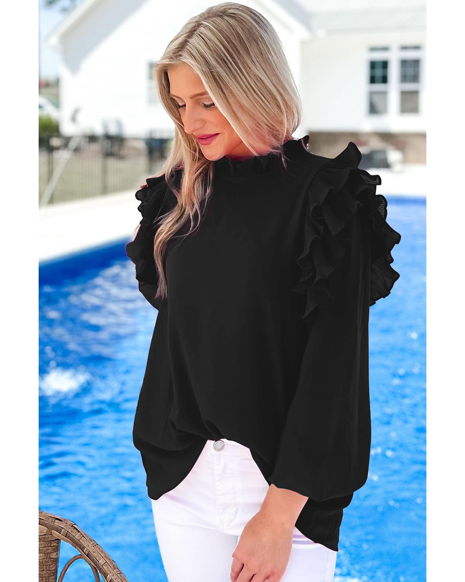 This blouse features a trendy fitted design with a stylish and versatile appearance. It is crafted with attention to detail, offering a flattering silhouette and feminine touches. The design includes a keyhole back, pleated elements, and playful ruffle trim, making it suitable for various occasions and styles.