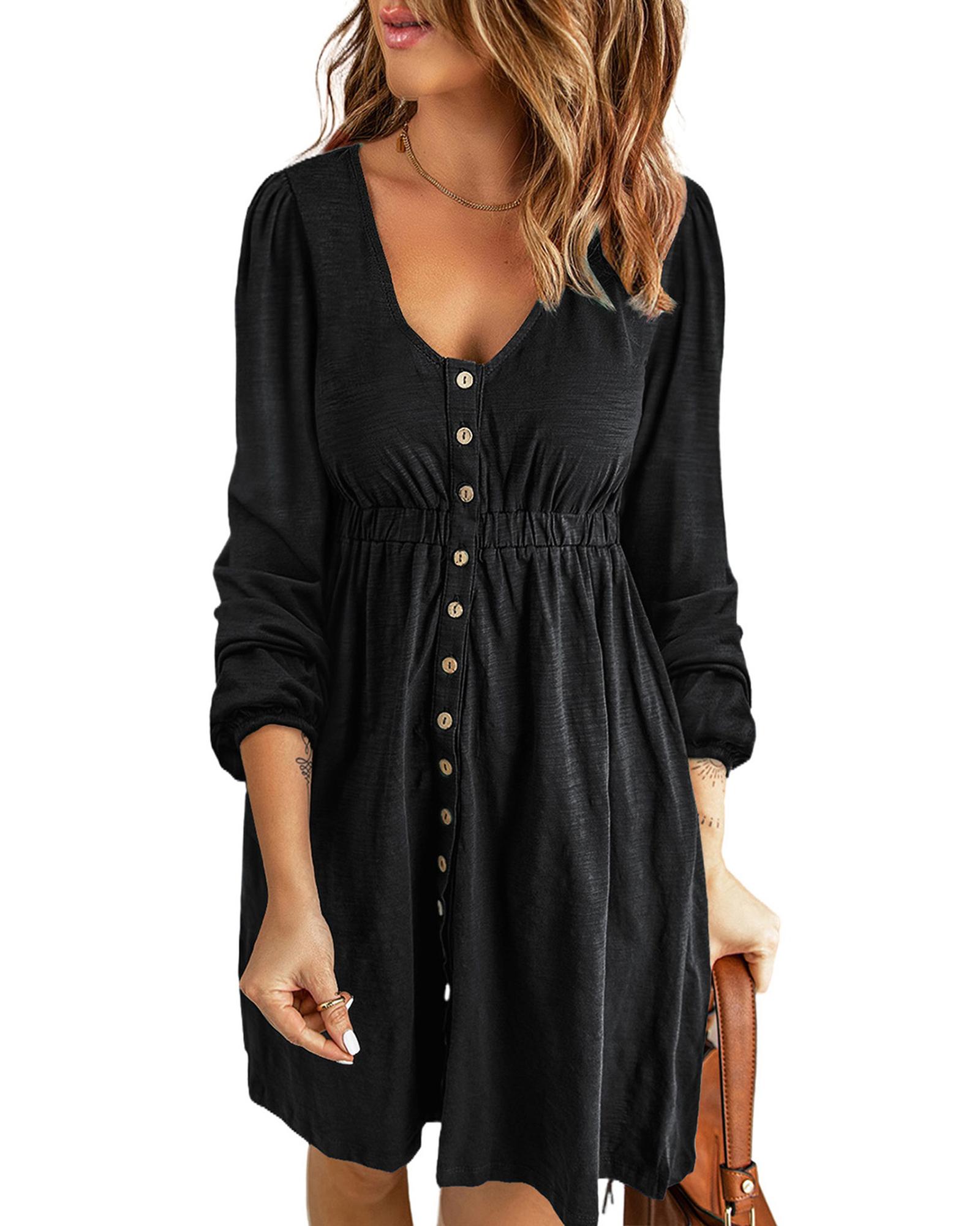 This black button-up high waist long sleeve dress offers a trendy fitted silhouette with versatile styling options. Designed with comfort and style in mind, it features a scoop neckline, long sleeves, and an elastic waist for a flattering fit. Made from soft, lightweight, and breathable fabric, it is suitable for various occasions and can be paired with different footwear such as boots, sneakers, sandals, or high heels.