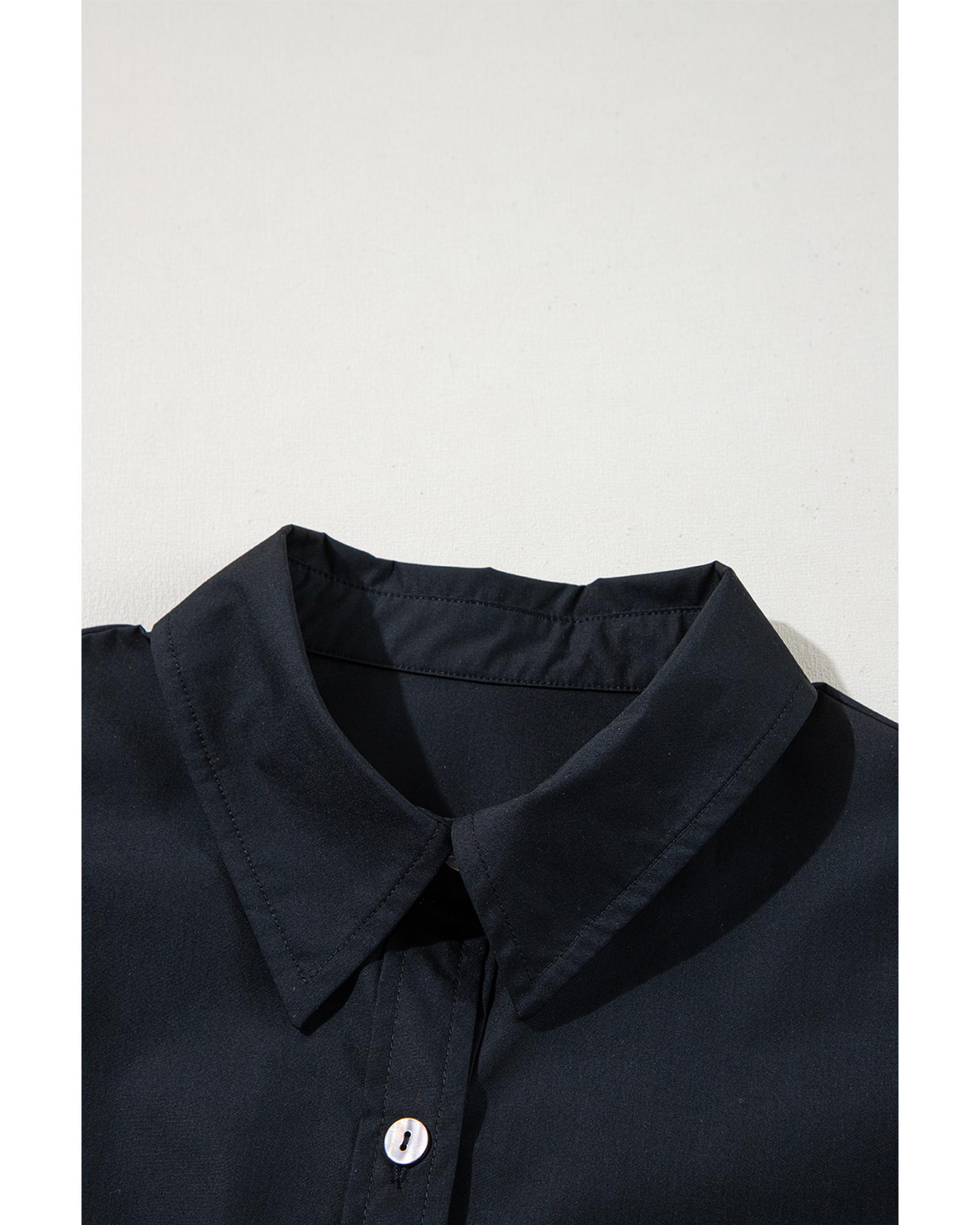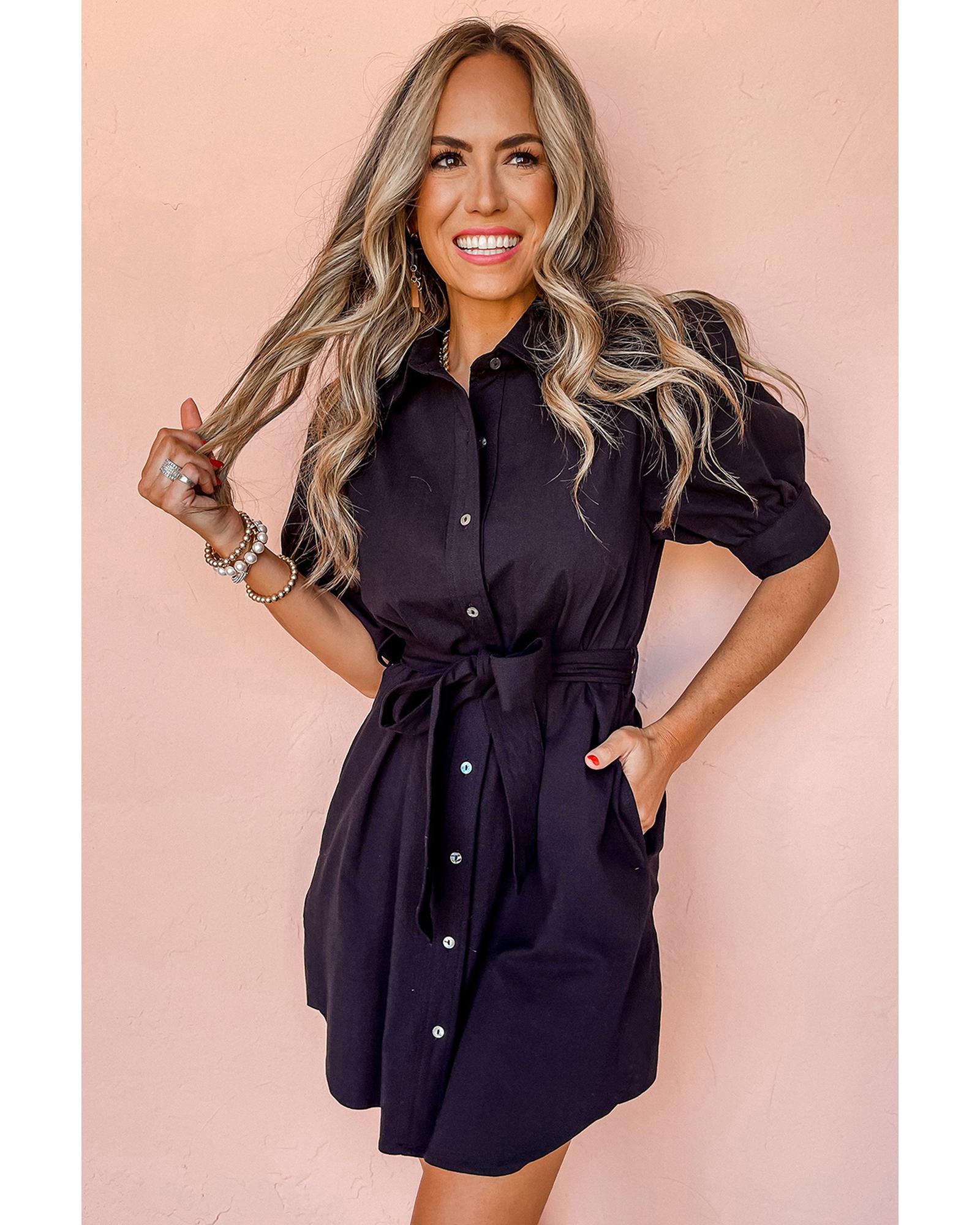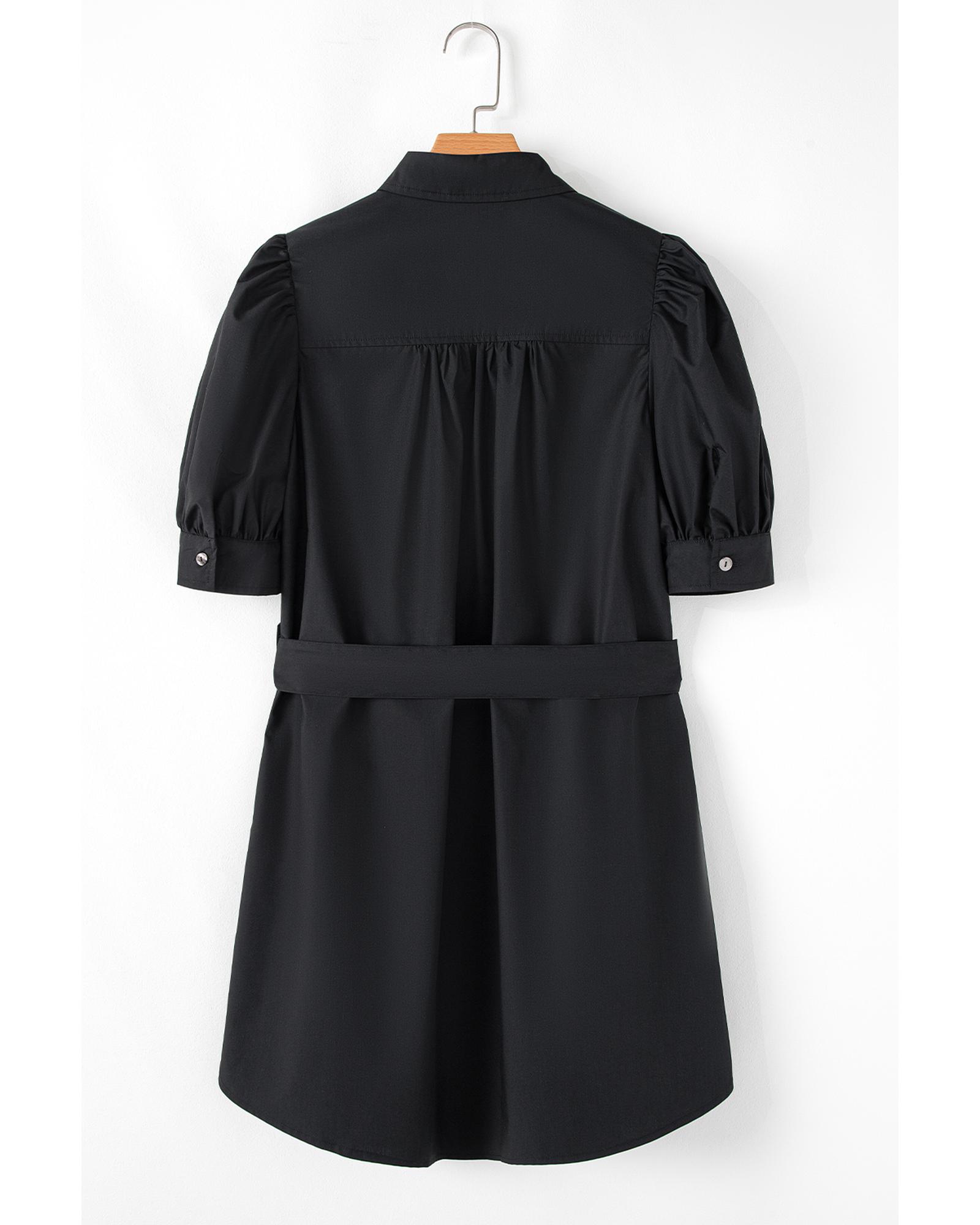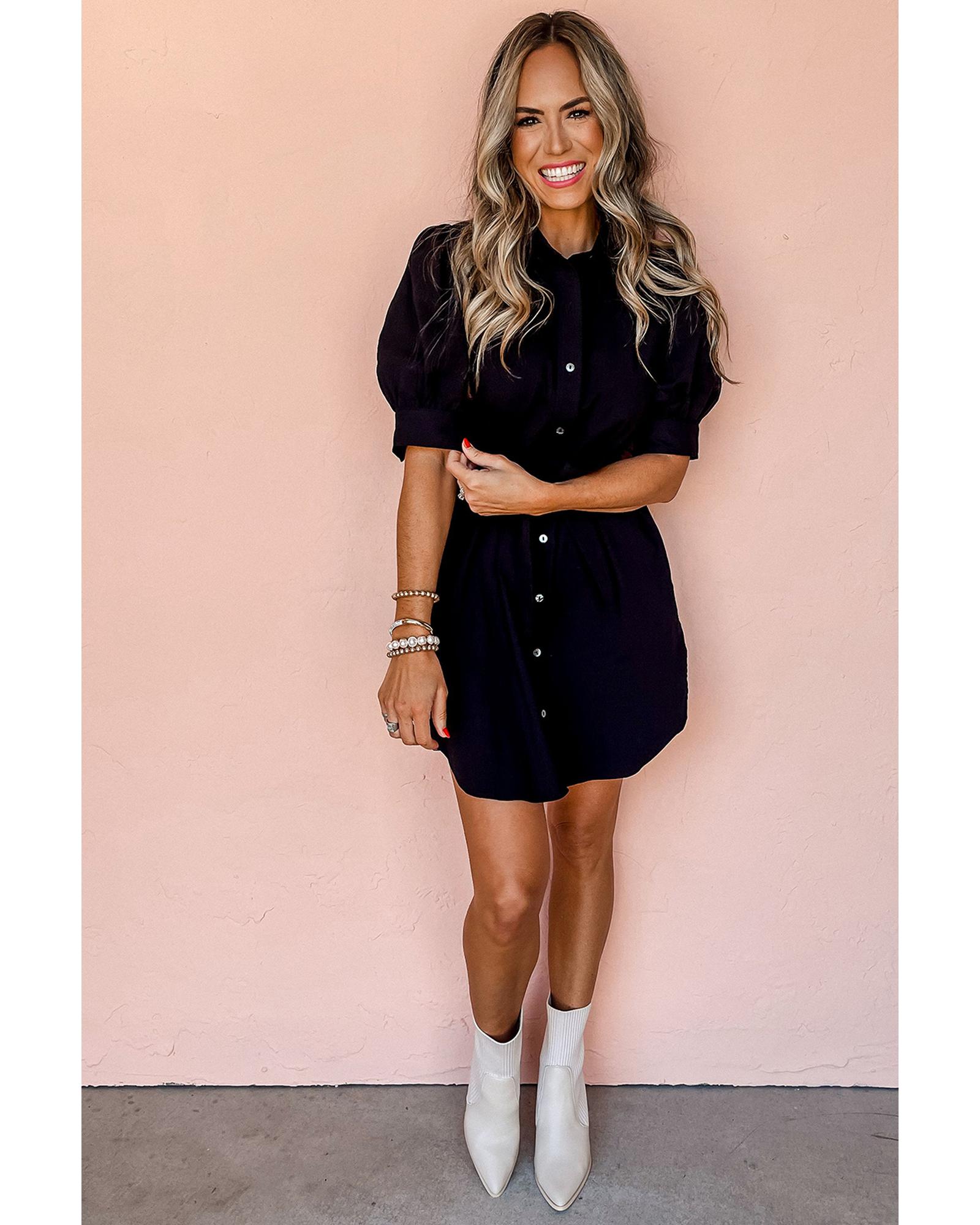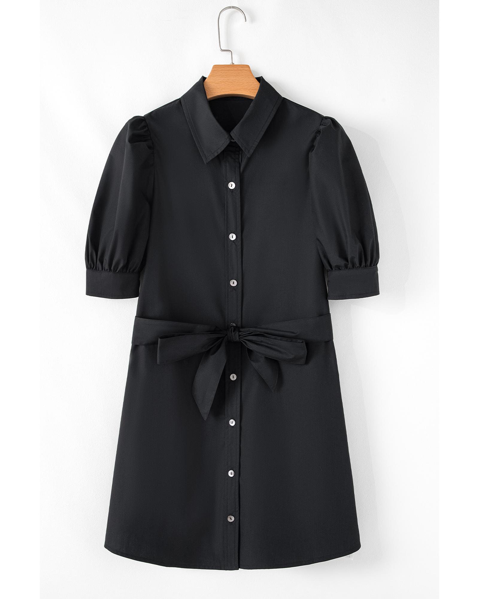 Black Button Up Tie Waist Puff Sleeve Mini Dress – XL