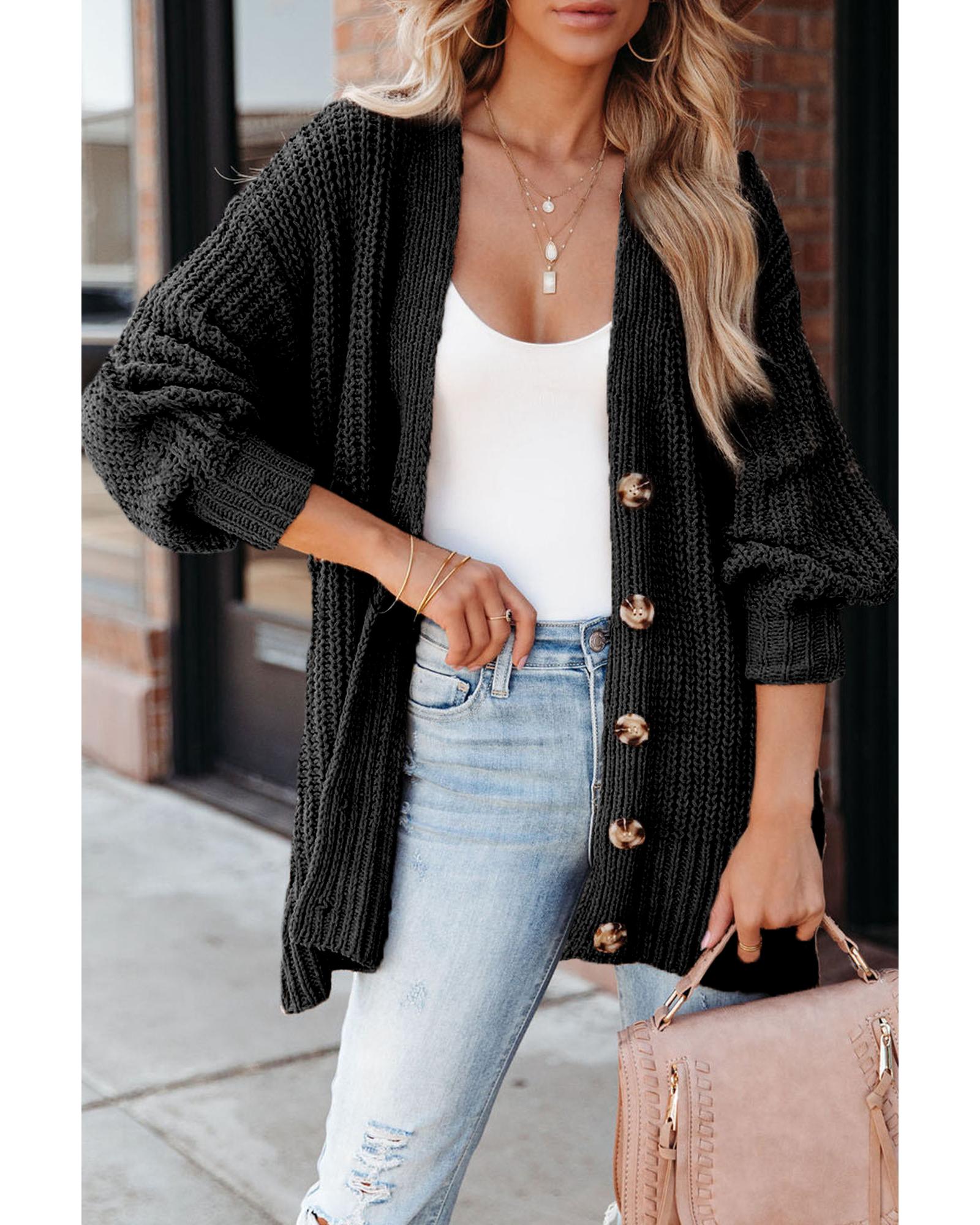 This black buttoned front drop shoulder knitted cardigan offers a stylish and cozy option for casual winter wear. Its relaxed fit and chic design make it a versatile addition to any wardrobe, suitable for layering over various tops.