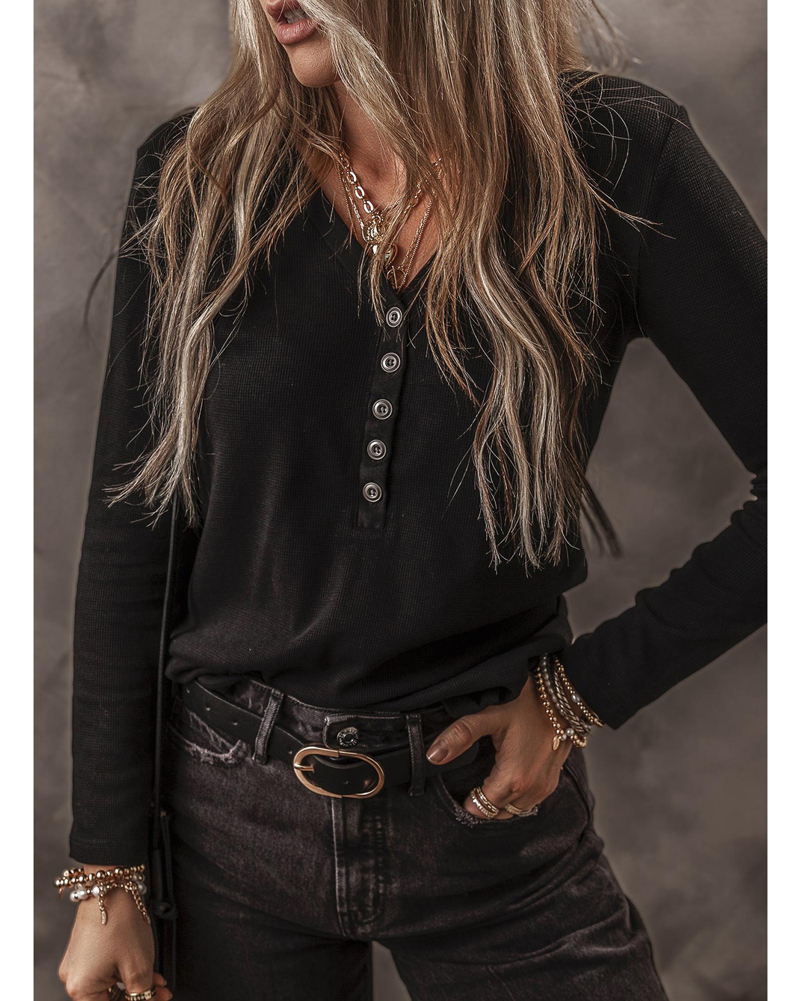 This black buttoned V-neck long sleeve ribbed top offers a stylish and versatile look suitable for various occasions. Designed with a trendy fitted silhouette, it combines comfort and fashion effortlessly. The ribbed texture and button details add a touch of sophistication, making it a great addition to any wardrobe.