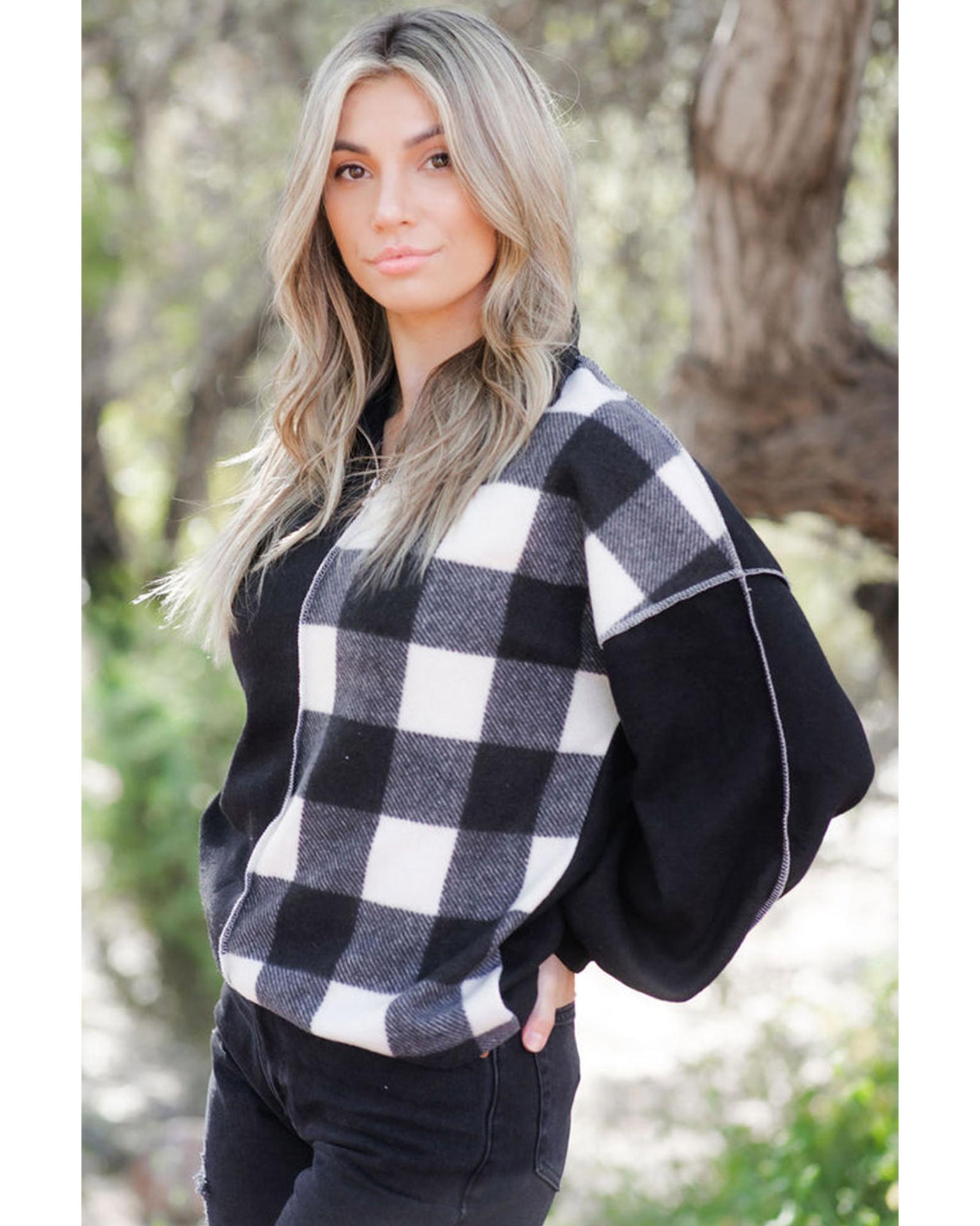 This collared top features a distinctive black checkboard patchwork design with exposed stitching, creating a bold and edgy look. Its versatile style makes it suitable for both formal and casual occasions, offering a trendy fitted silhouette that aligns with international sizing standards.