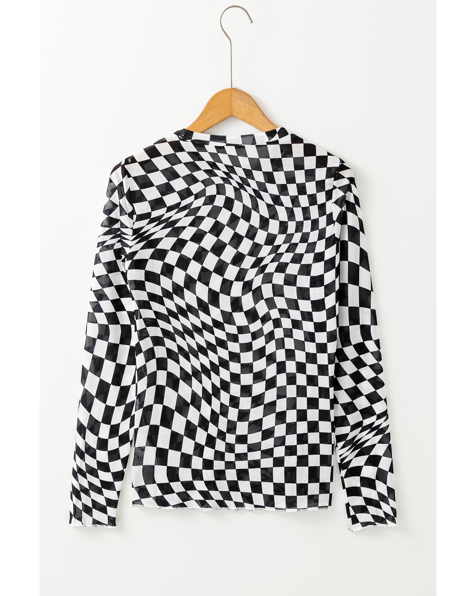 This black checkered pattern mesh mock neck long sleeve top combines a trendy fitted style with classic design elements. Crafted from stretchy mesh material, it offers both comfort and a fashionable appearance suitable for various casual occasions. The long sleeves and mock neck design make it a versatile choice for different seasons.