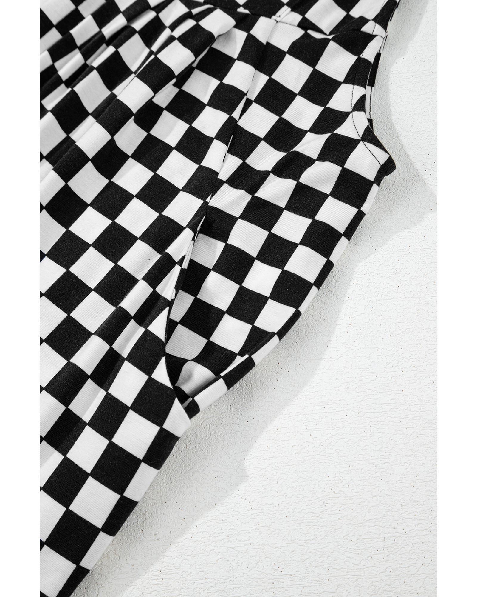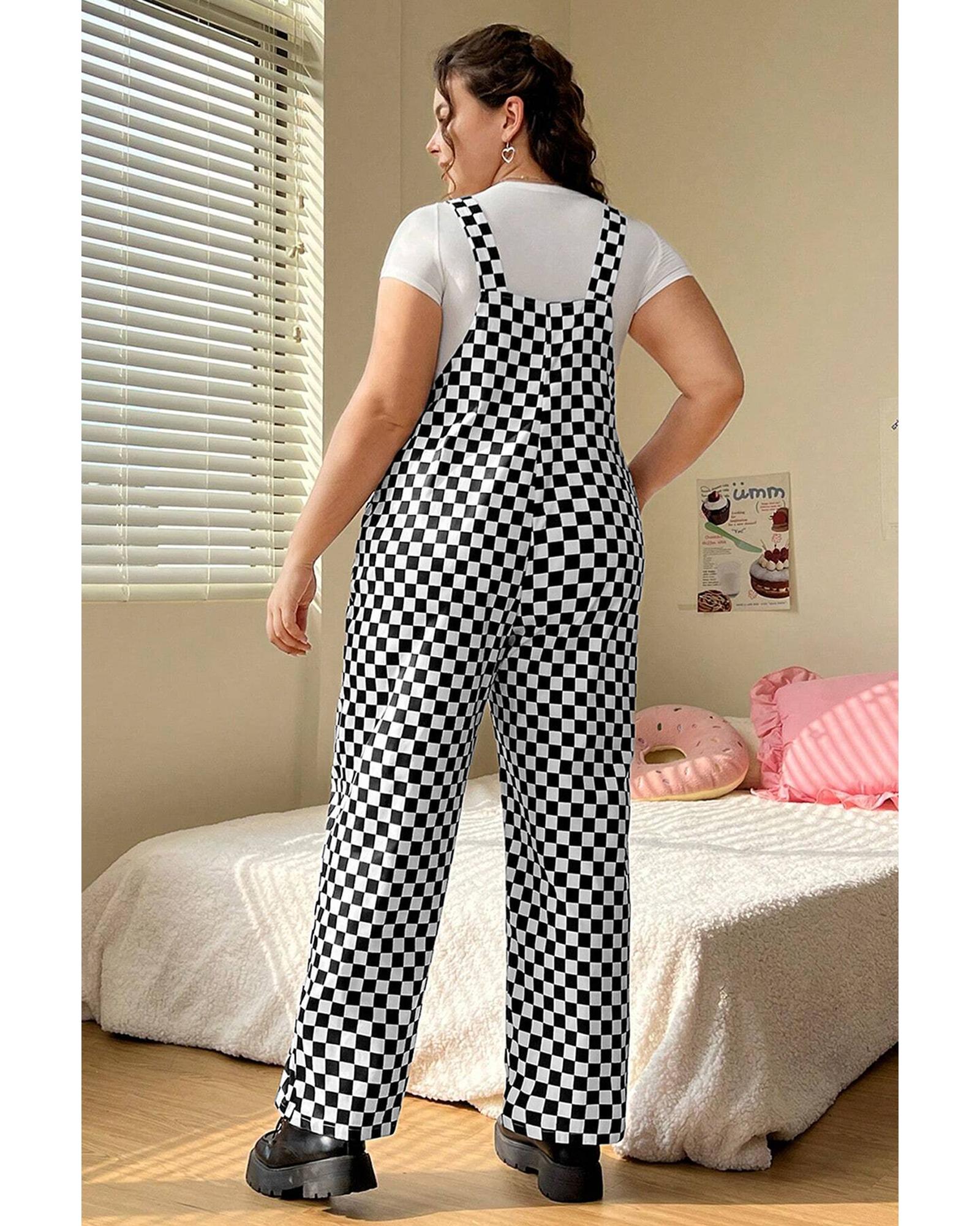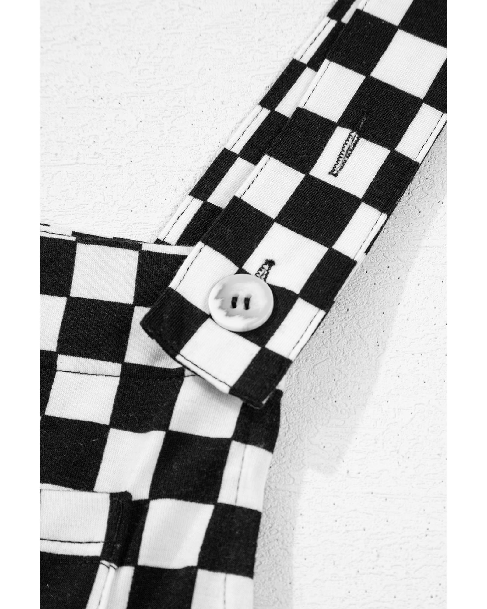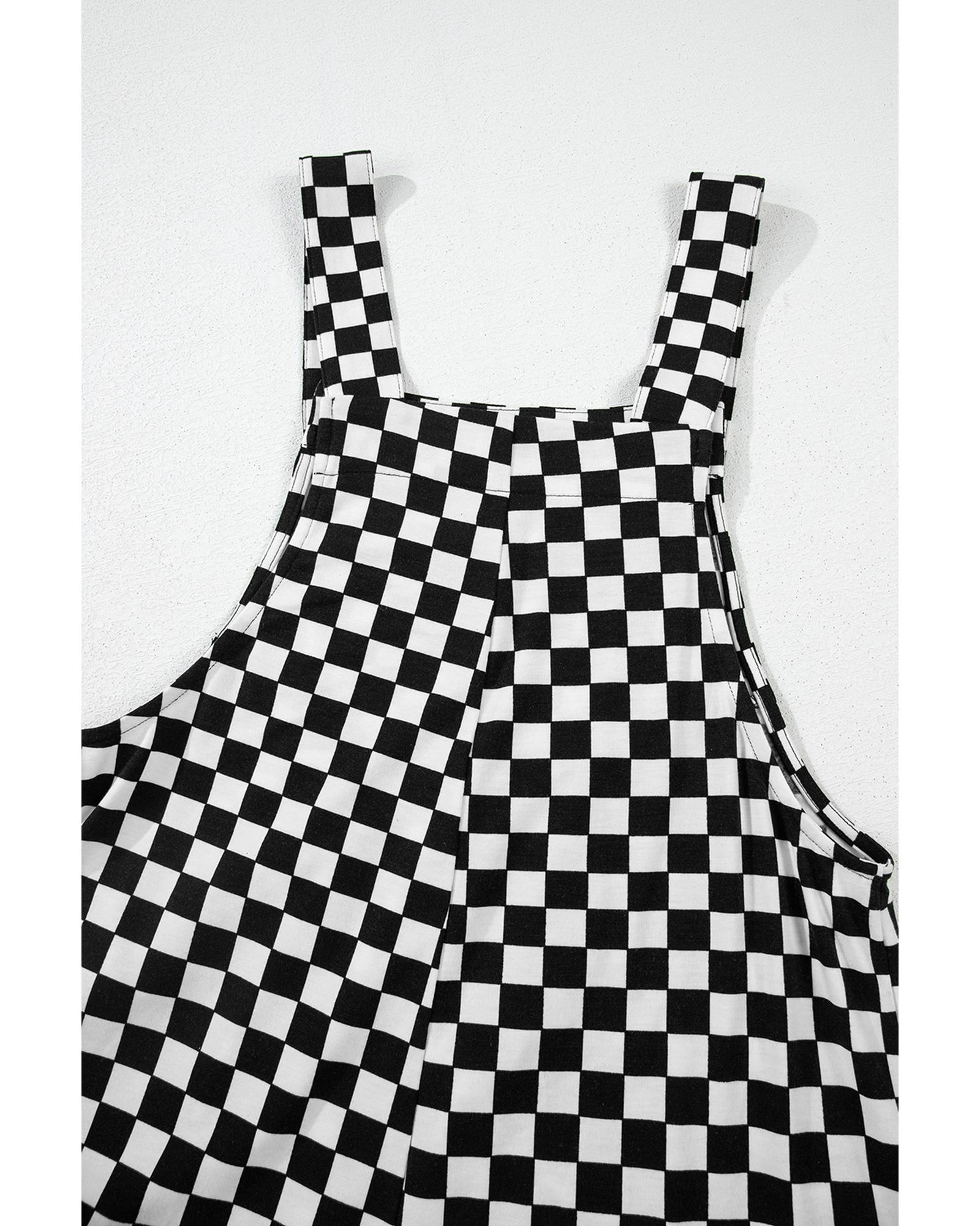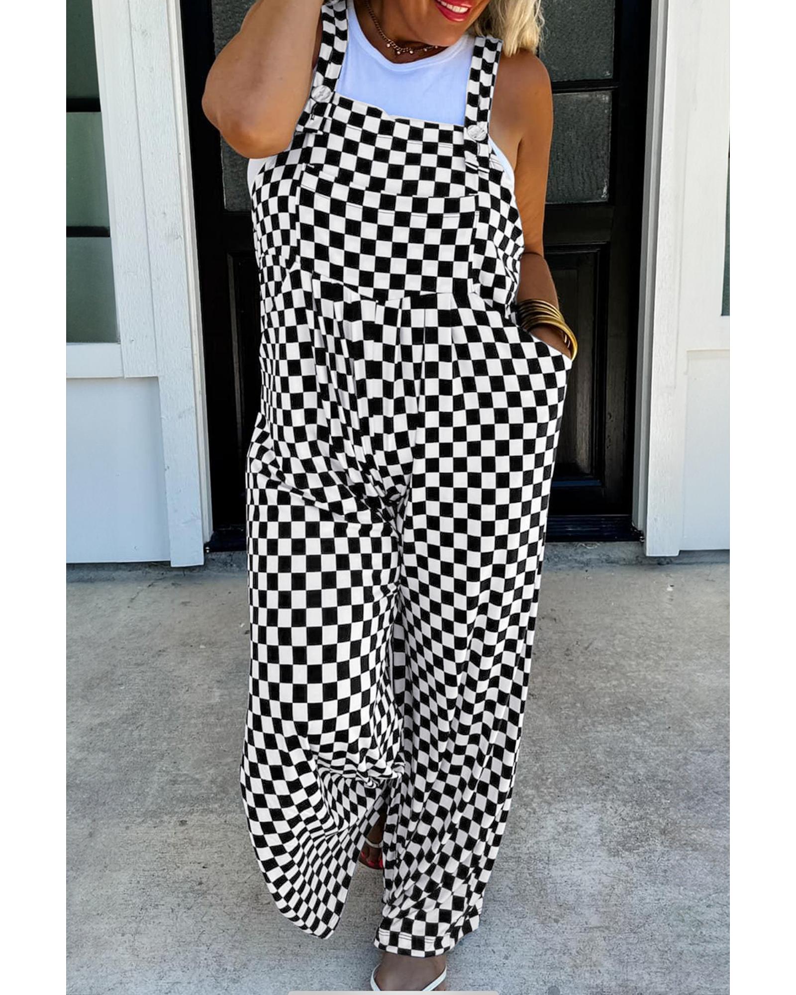 This black checkered print pocketed wide leg jumpsuit offers a stylish and comfortable casual look. Designed with a loose fit and adjustable straps, it provides ease of movement and a relaxed silhouette. The jumpsuit features side pockets and a casual bib design, making it suitable for various casual occasions.