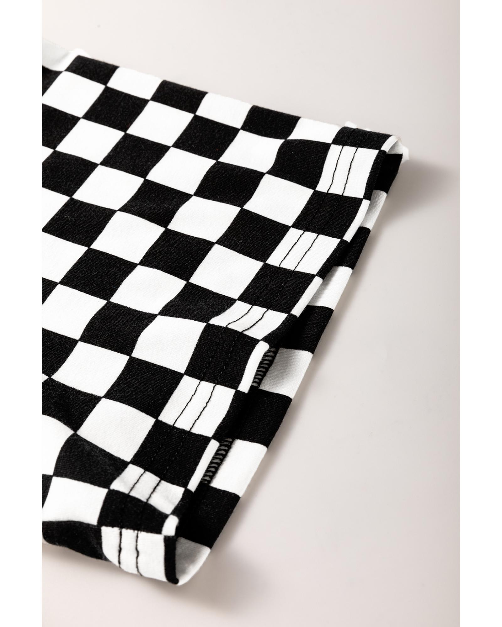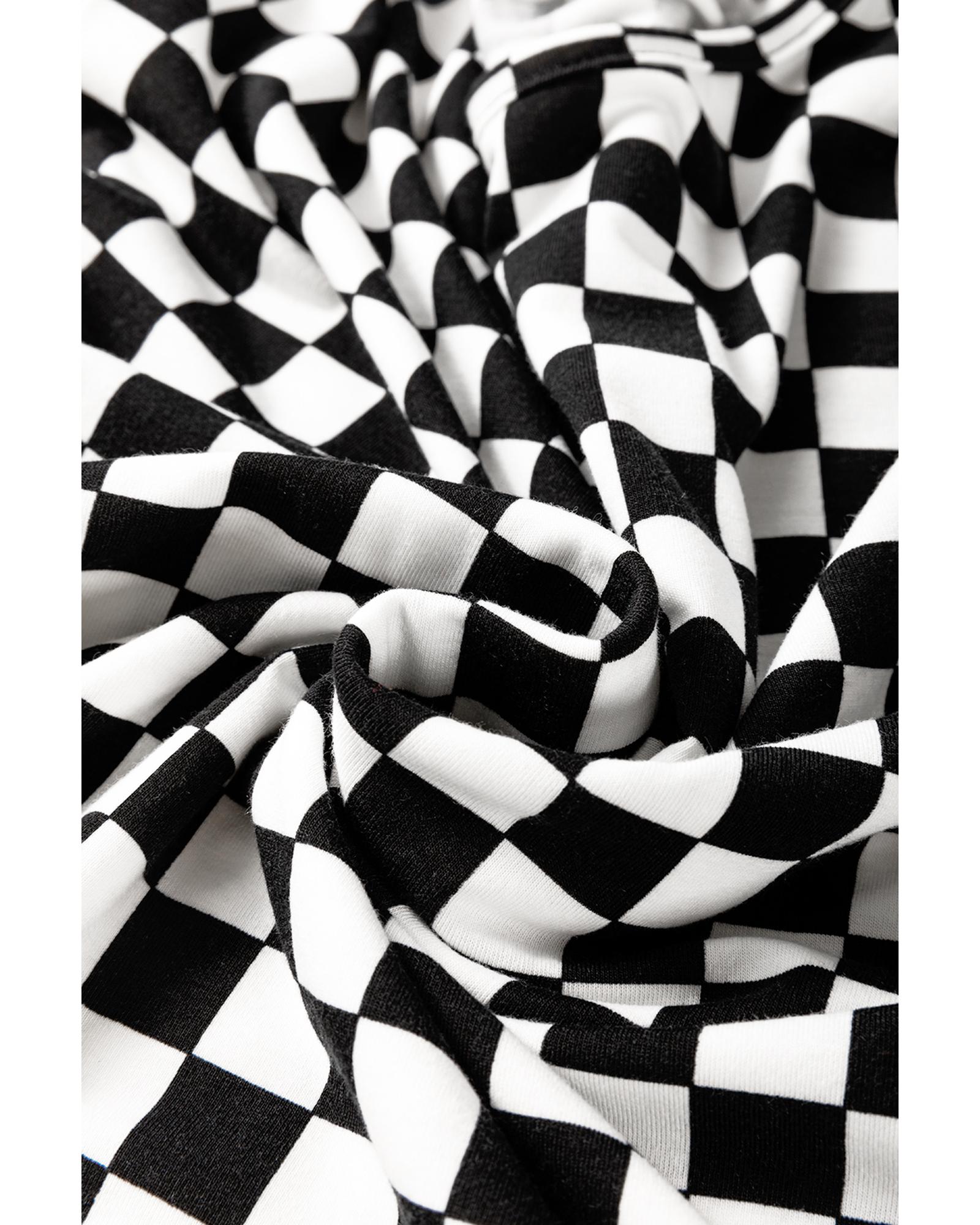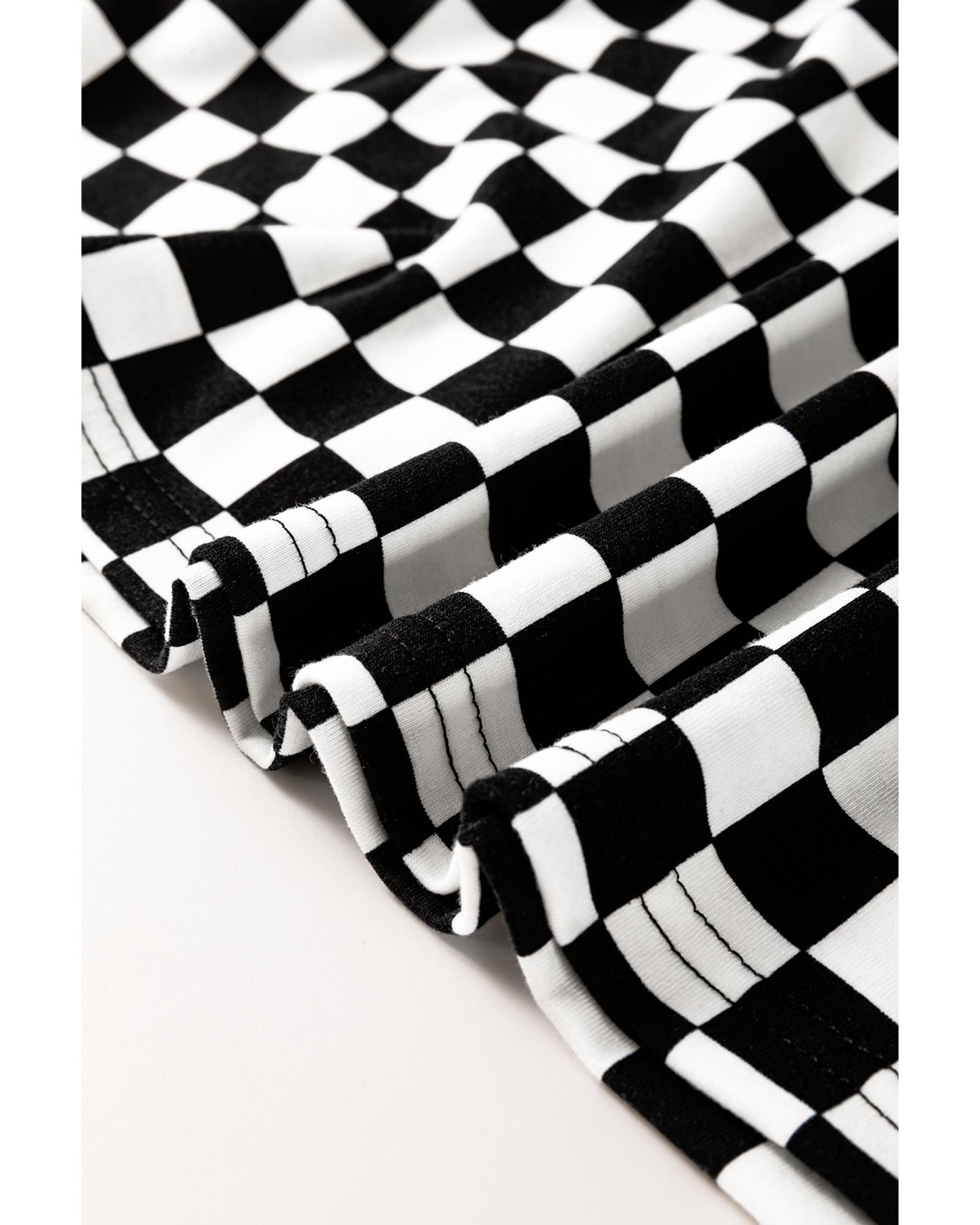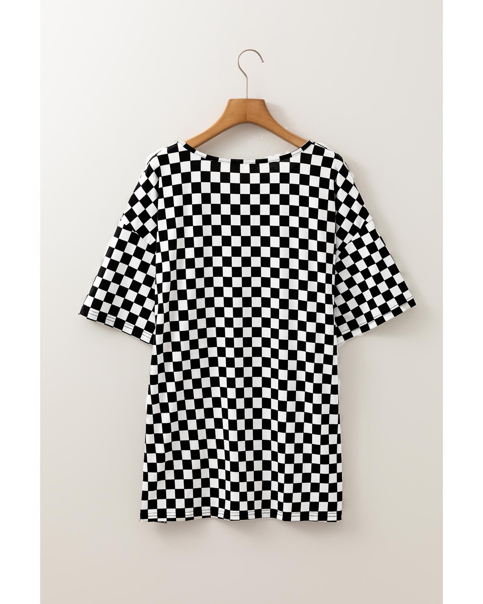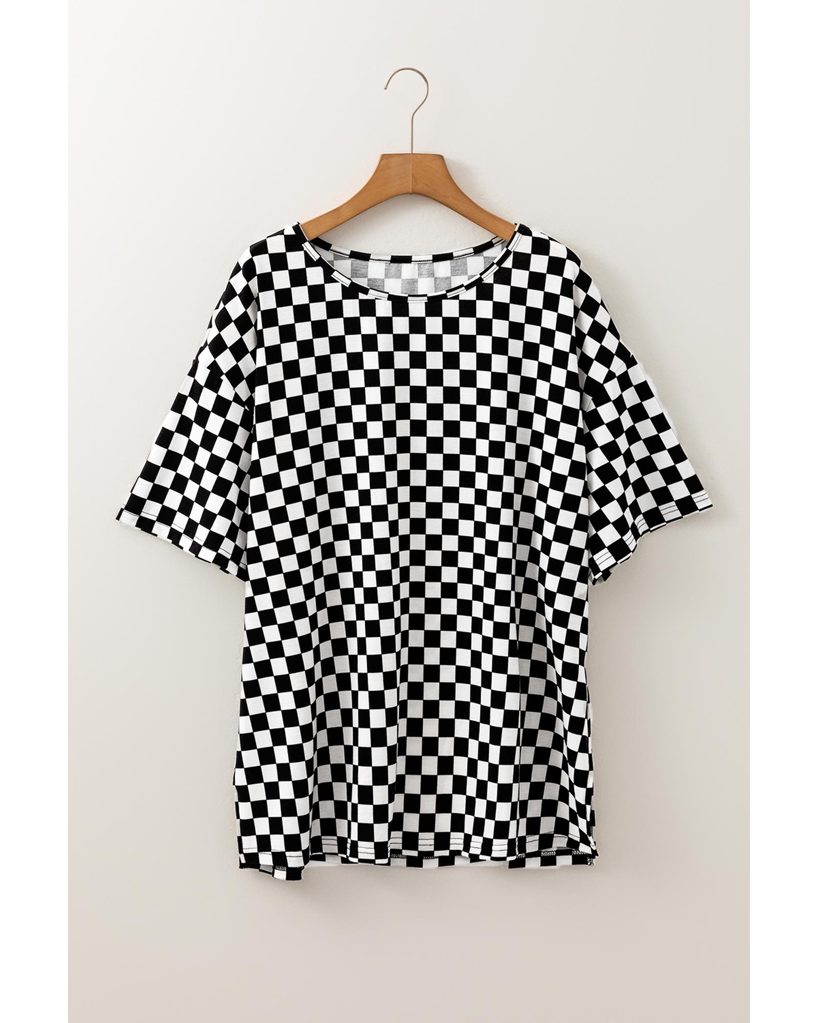 This plus size T-shirt features a bold black checkered print with a classic pattern, designed for a trendy and comfortable fit. It includes stylish side slits and an O neck design, making it a versatile addition to your casual wardrobe. The oversized fit ensures comfort, while the fine fabric provides a pleasant wearing experience. Suitable for pairing with leggings or biker shorts, this shirt is available in multiple plus sizes.