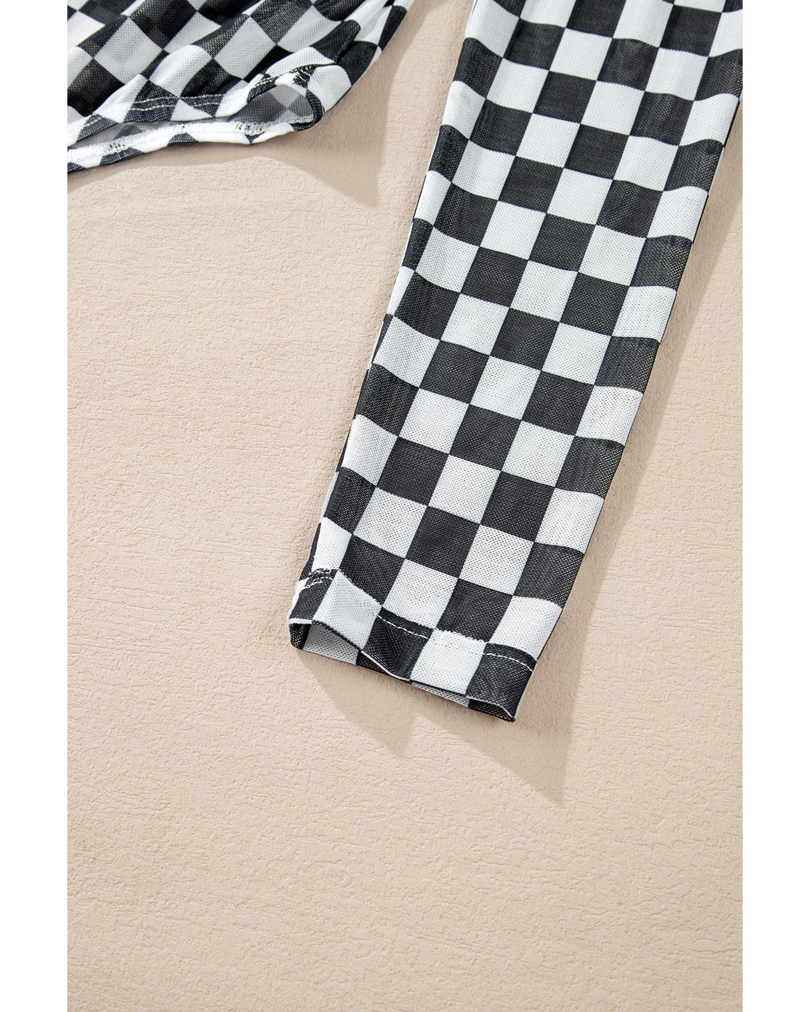 This black checkered printed long sleeve high neck bodysuit offers a stylish and versatile addition to your wardrobe. Designed with a trendy fitted silhouette, it provides both comfort and a flattering fit, making it suitable for various outfit combinations. The long sleeves and high neck add a touch of sophistication and warmth, perfect for cooler days.