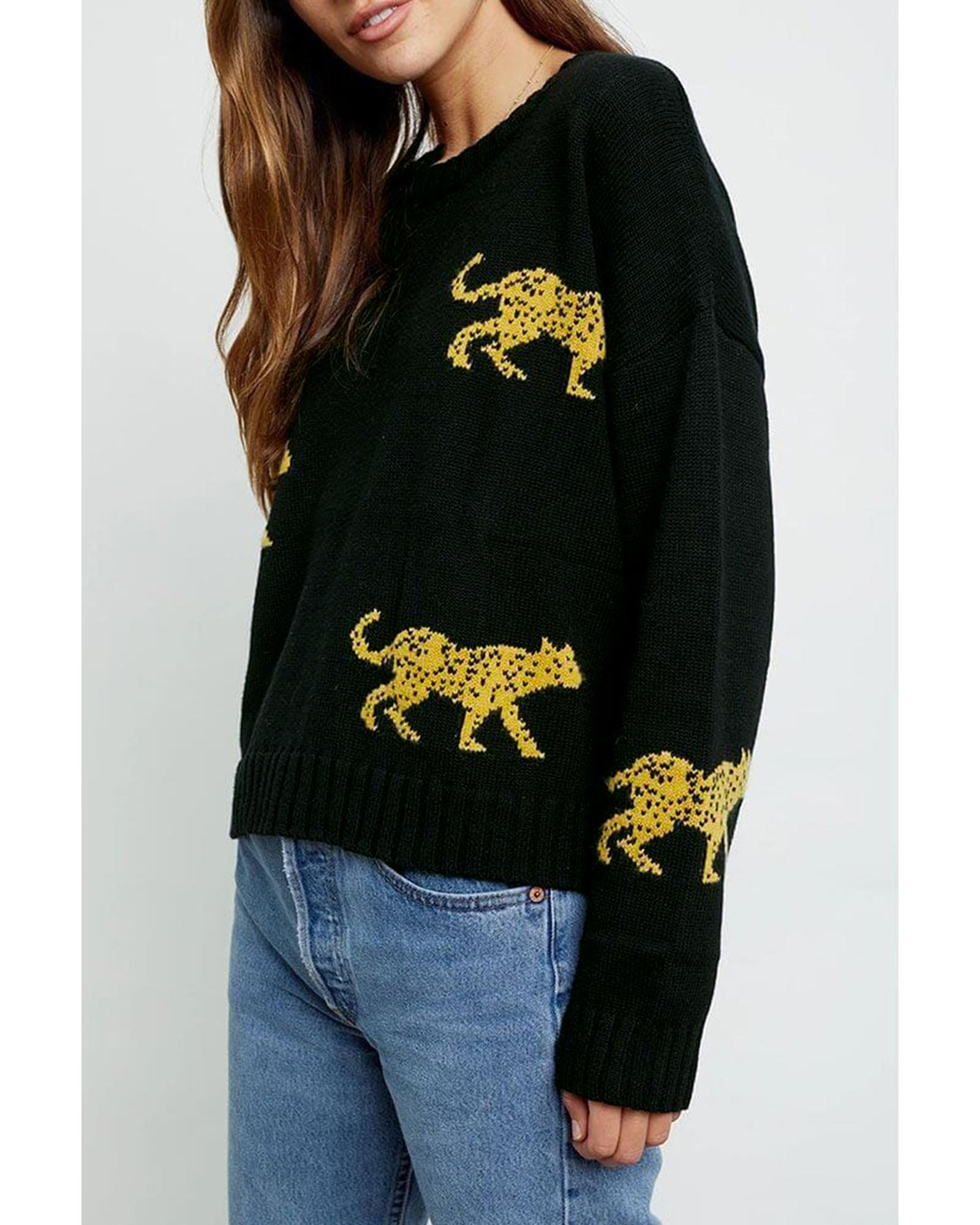 This sweater features a stylish black cheetah pattern and a classic round neck design, making it a versatile addition to any wardrobe. Crafted with a comfortable knit construction, it is suitable for all genders and offers a trendy fitted look.