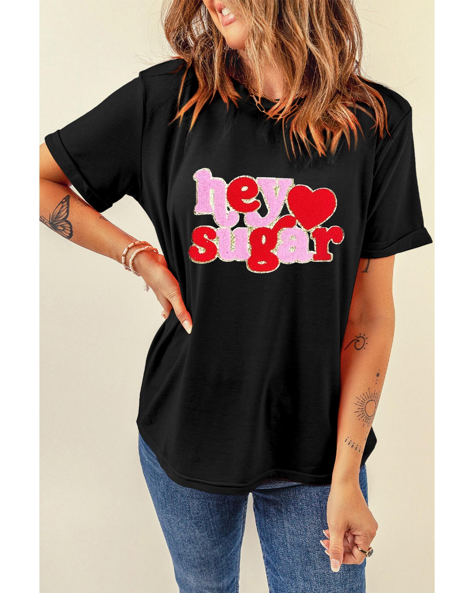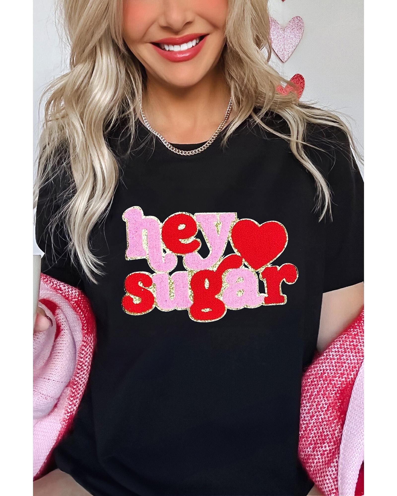 Black Chenille Heart hey sugar Patched Crewneck Valentines Tee – 2XL