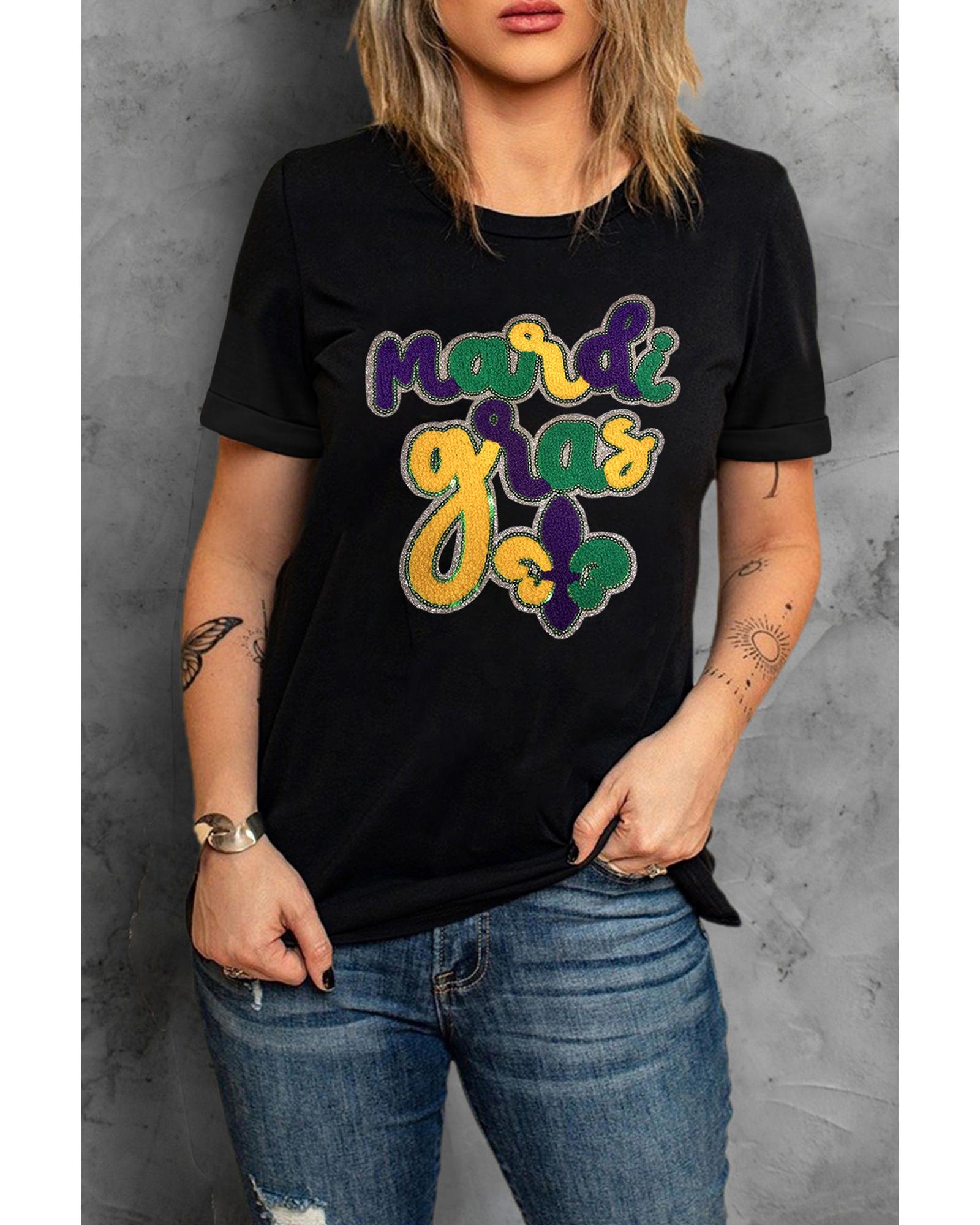 Black Chenille Mardi Gras Letter Graphic Tee – L