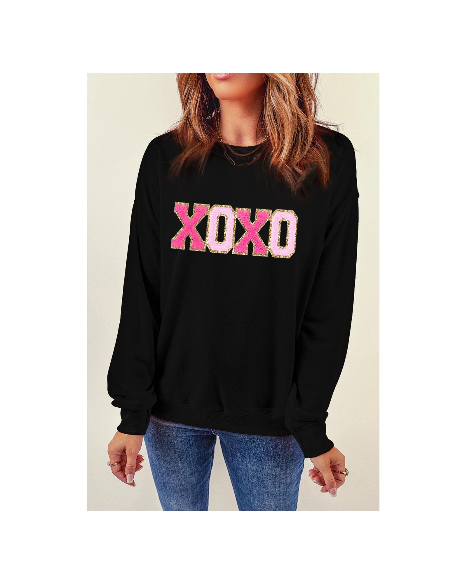 Black Chenille XOXO Patched Drop Shoulder Valentines Pullover Sweatshirt – M