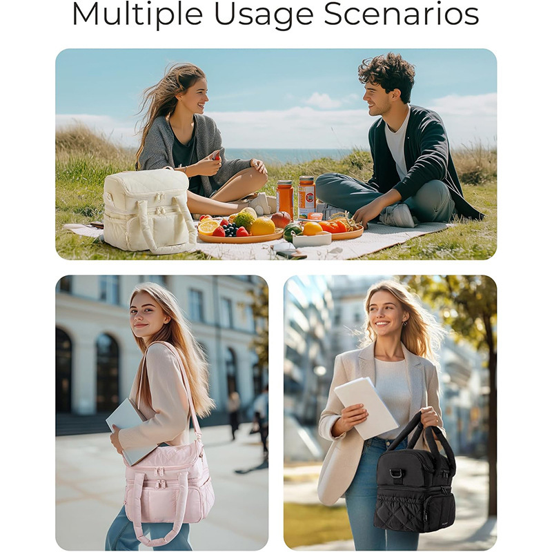 This insulated lunch bag offers a stylish and functional solution for carrying meals on the go. Its dual-compartment design and excellent insulation help keep food fresh and at the desired temperature for hours, making it suitable for work, picnics, camping, or outings.