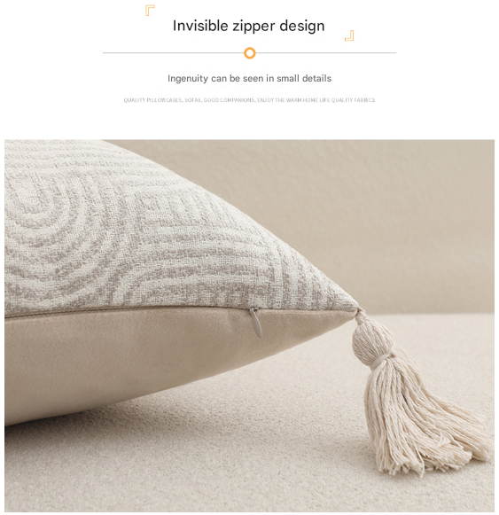 Enhance your home decor with a stylish set of two cushion covers featuring a geometric jacquard pattern and tassel accents. Made from a soft and durable blend of cotton and polyester, these covers are designed to add a touch of modern elegance and comfort to your sofa or bed. The covers are easy to insert and remove thanks to a hidden zipper closure, and their neutral tones make them versatile for various interior styles.