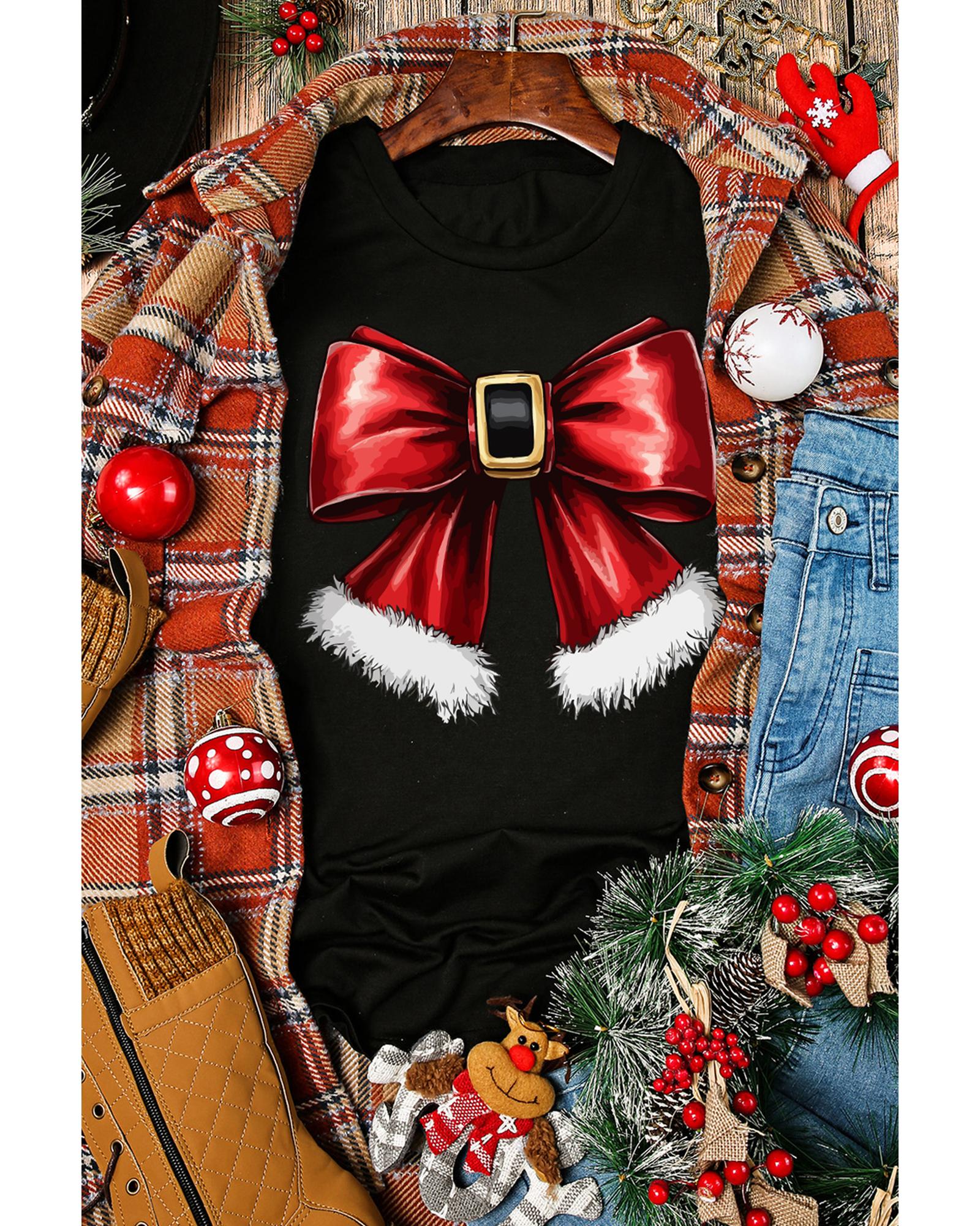 This crewneck T-shirt features a festive design with a large bowknot graphic, making it a stylish choice for holiday occasions. Its classic crew neck and short sleeves provide comfortable wear, suitable for pairing with jeans or casual pants. The shirt is designed with a trendy fitted look, following international sizing standards.