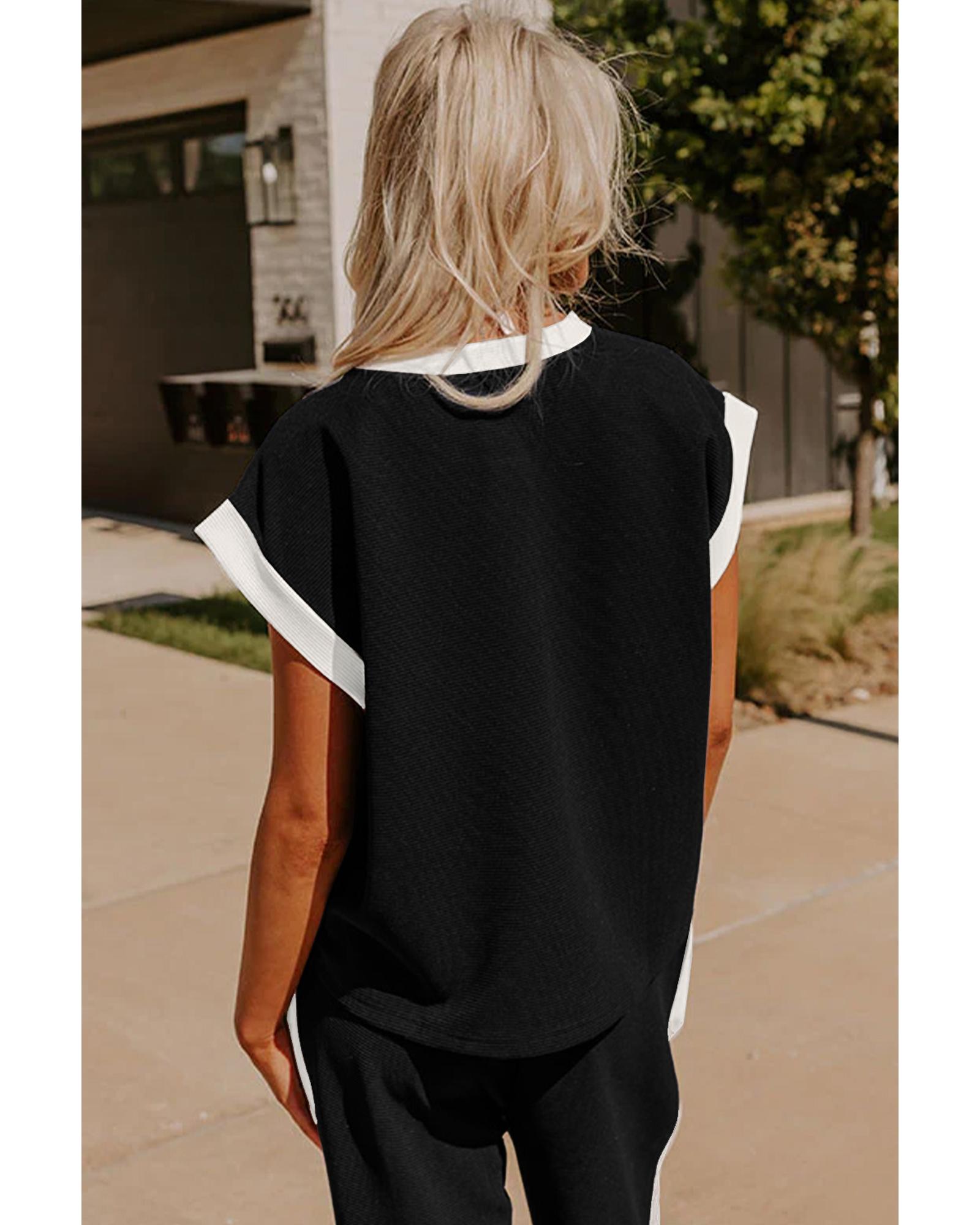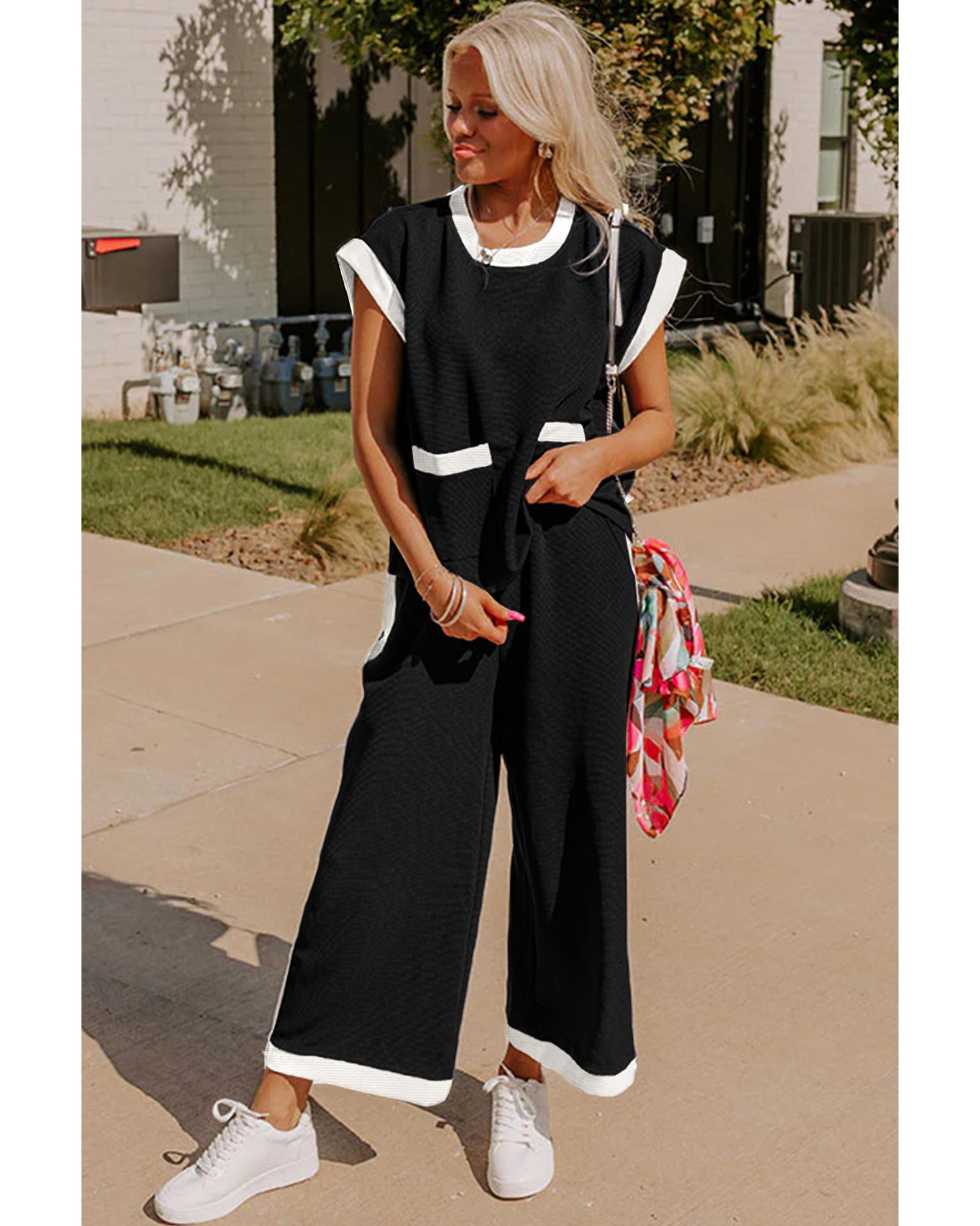 This stylish two-piece set features a colorblock design with contrast trim details, offering a modern and fashionable look. The set includes a cap sleeve T-shirt with front pockets and high-waisted wide-leg pants, making it suitable for various casual occasions.