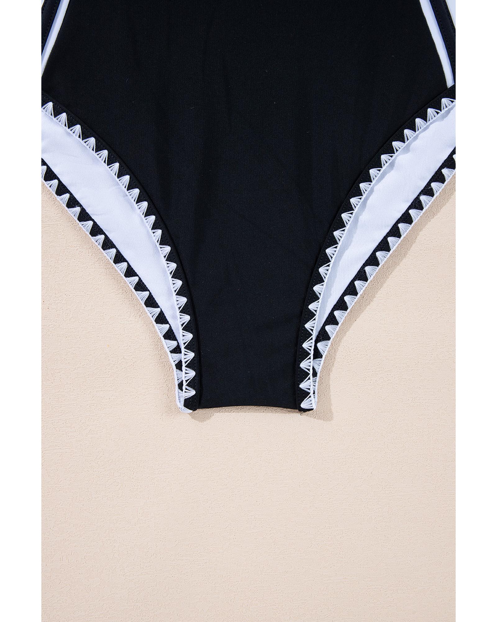 This black color block swimsuit features a stylish ric rac trim and a sexy U-neckline, designed to provide a slim fit silhouette. It offers high elasticity for comfort and is ideal for beach activities.