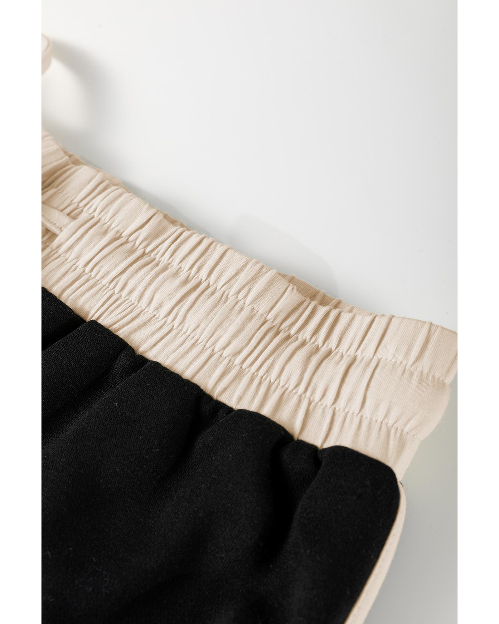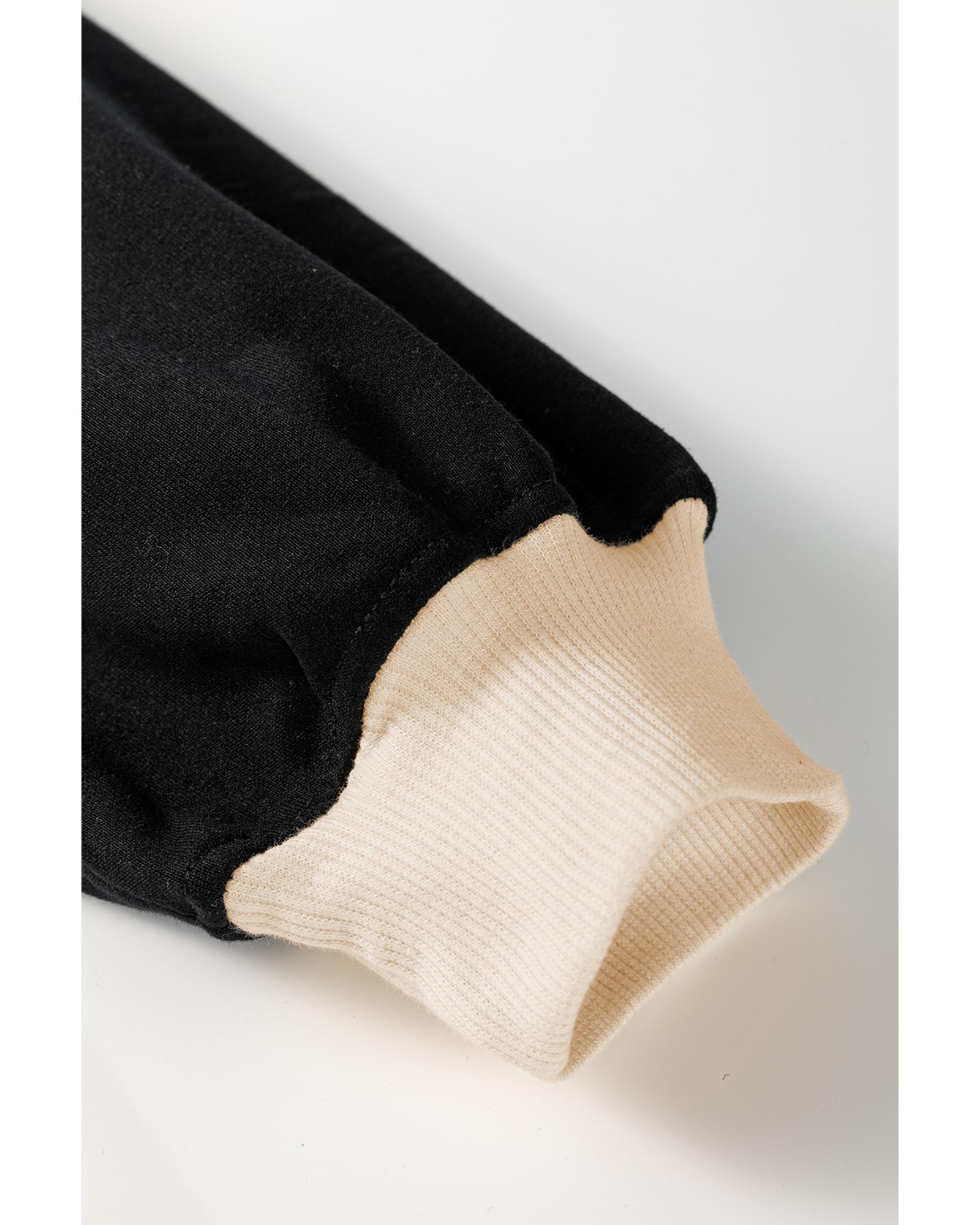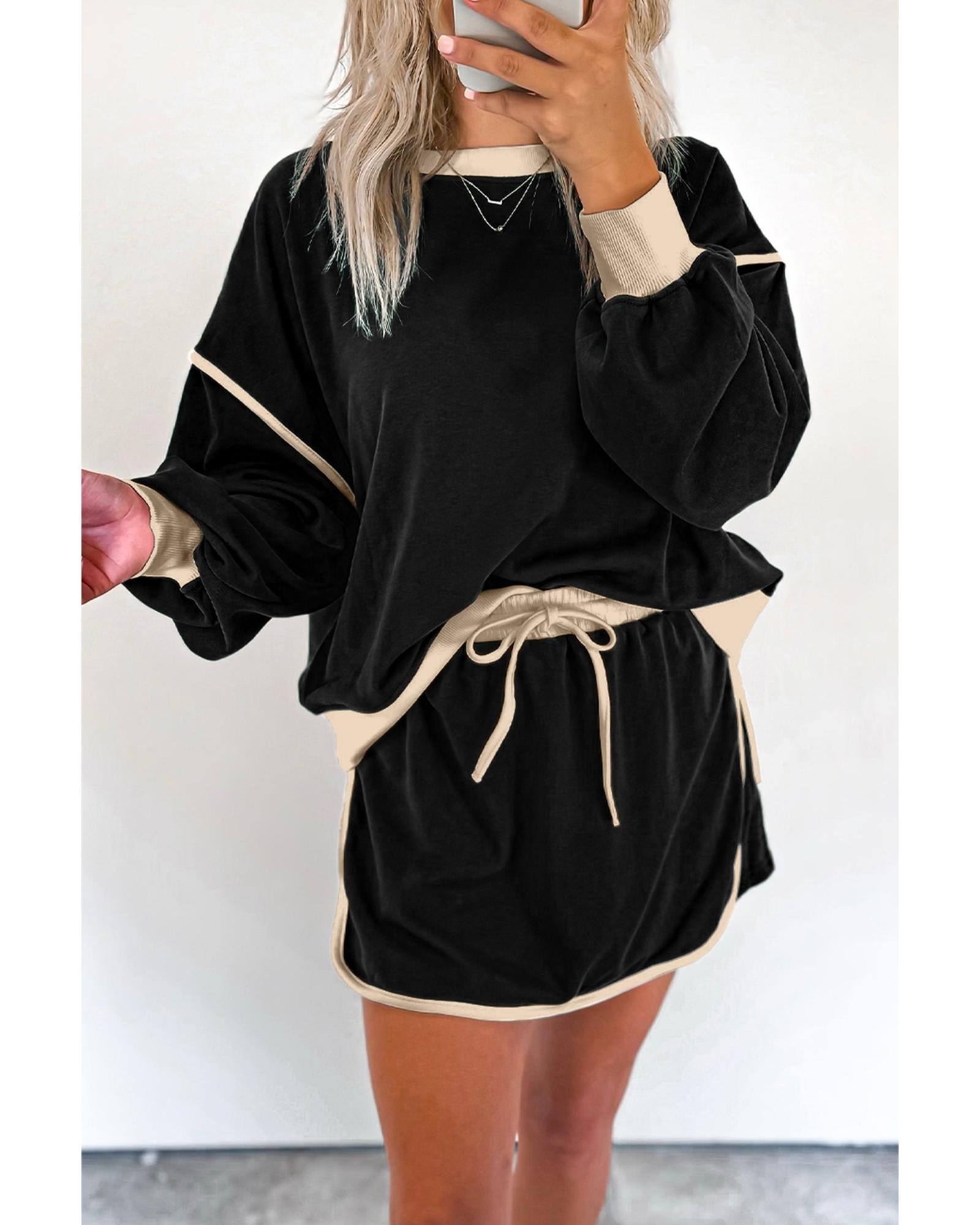 Black Color Contrast Loose Pullover and Lace-up Waist Skort Set – L