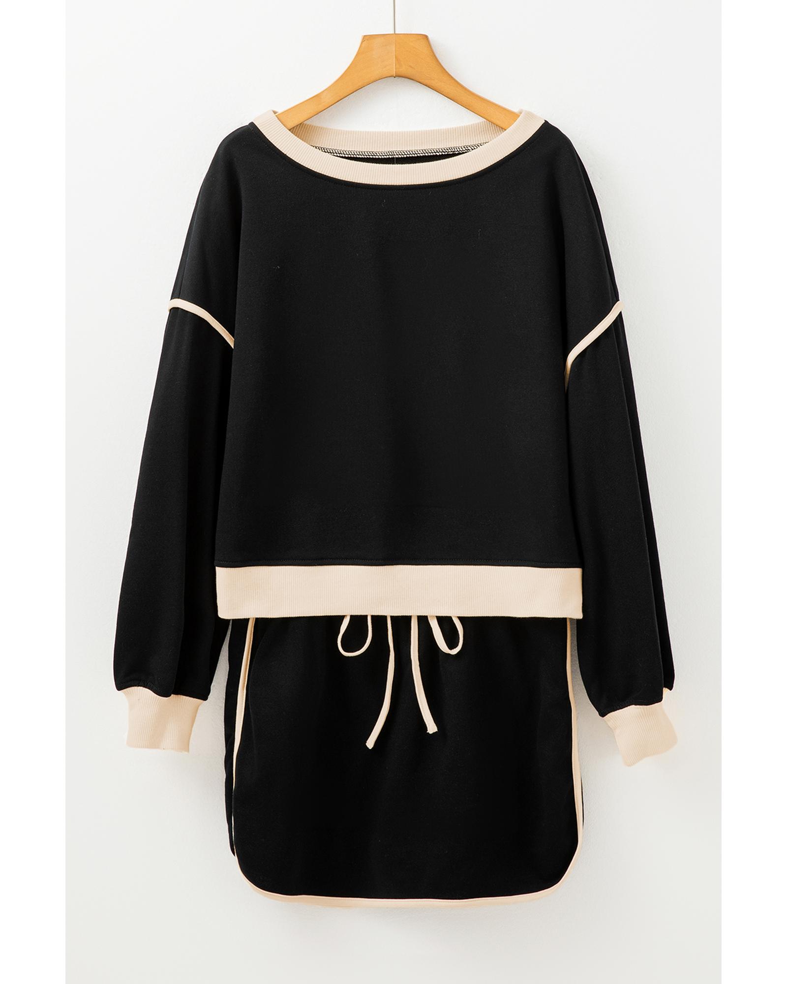 Black Color Contrast Loose Pullover and Lace-up Waist Skort Set – XL