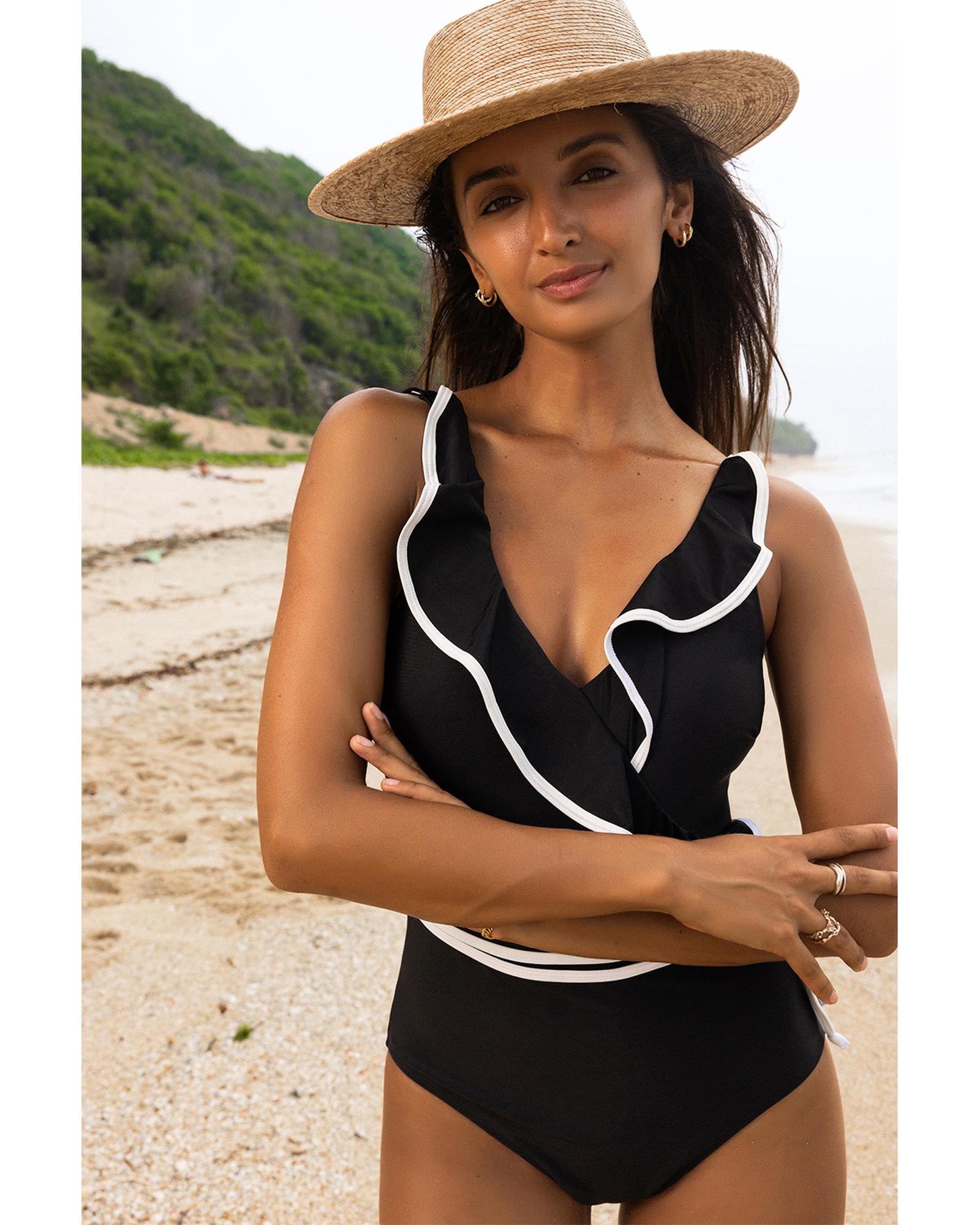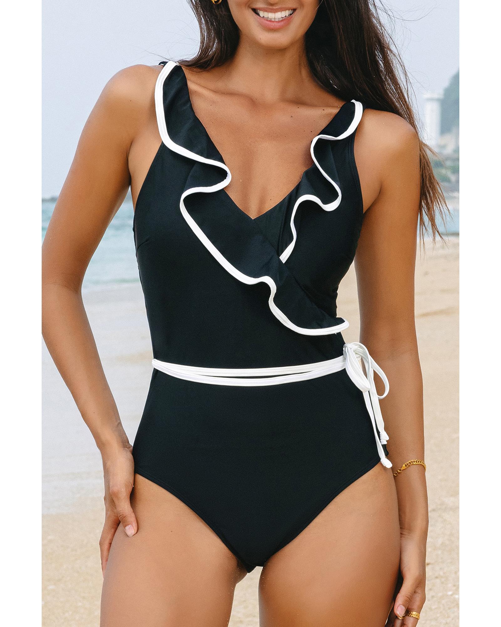 This black color contrast ruffled wrap V neck swimsuit combines trendy design with a flattering fit. It features delicate ruffled details and a waist tie that accentuates the waistline, offering a feminine and stylish look suitable for various body types. The high elasticity fabric ensures comfort and a secure fit for all-day wear.