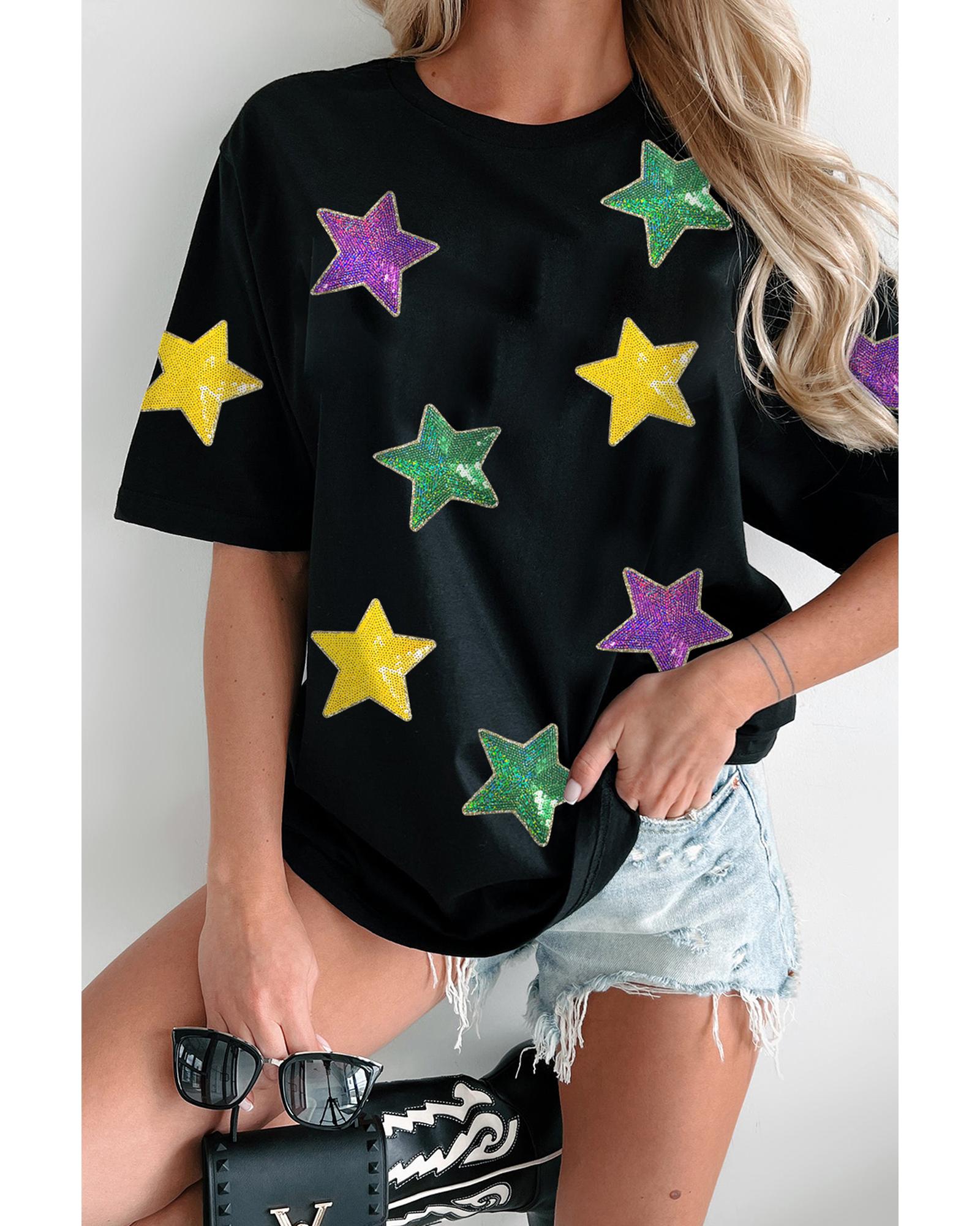 This colorful sequin star patched T-shirt offers a relaxed fit and vibrant design, making it suitable for both festive occasions and daily wear. The eye-catching sequin patches add a fun and playful touch to your outfit, ensuring you stand out in any setting.