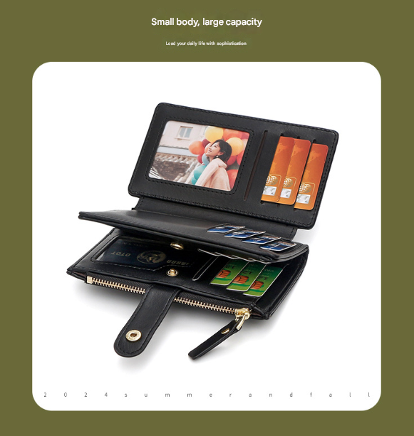 - Structure: Multiple card slots, ID window, banknote compartment, zippered coin pocket