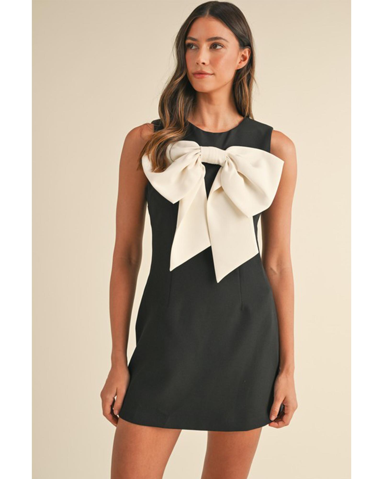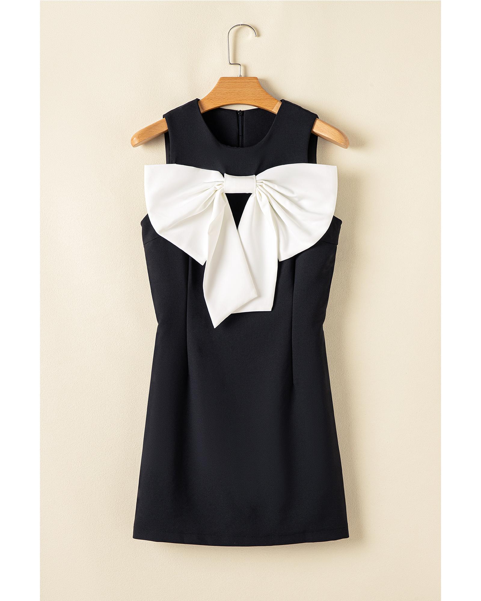 Black Contrast Bowknot Applique Crew Neck Sleeveless Mini Dress – XL
