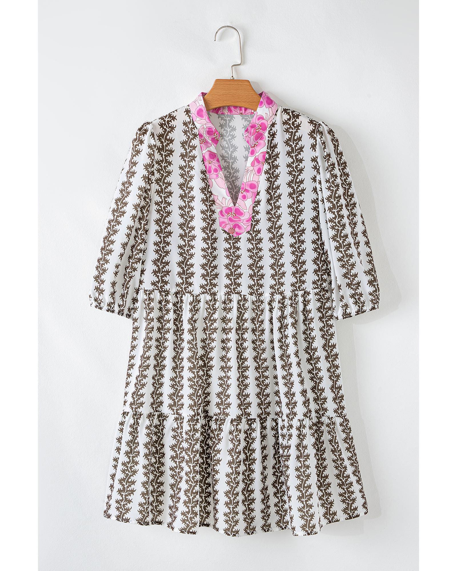 This dress features a stylish black contrast floral design with a V neckline and bracelet sleeves, making it a versatile choice for both casual and special occasions. Crafted from lightweight and breezy fabric, it offers comfort and elegance.