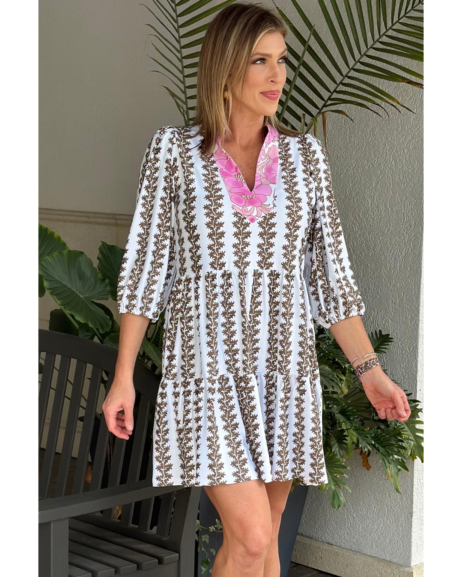 This dress features a stylish black contrast floral design with a V neckline and bracelet sleeves, making it a versatile choice for both casual and special occasions. Crafted from lightweight and breezy fabric, it offers comfort and elegance for various settings.